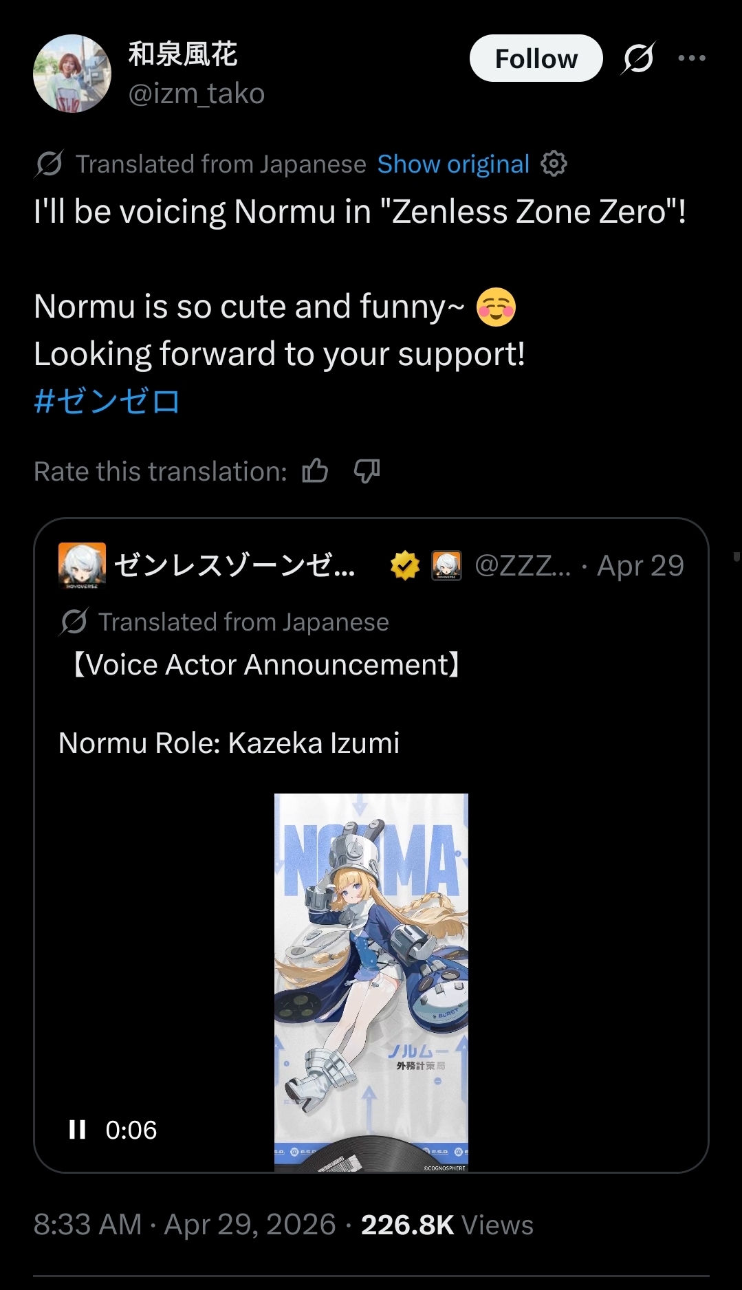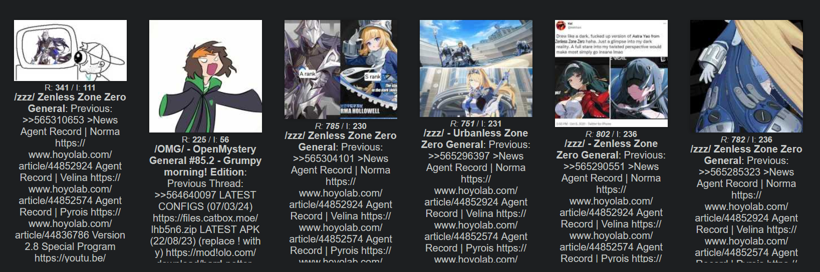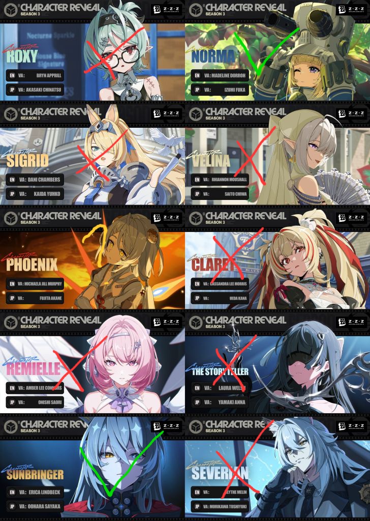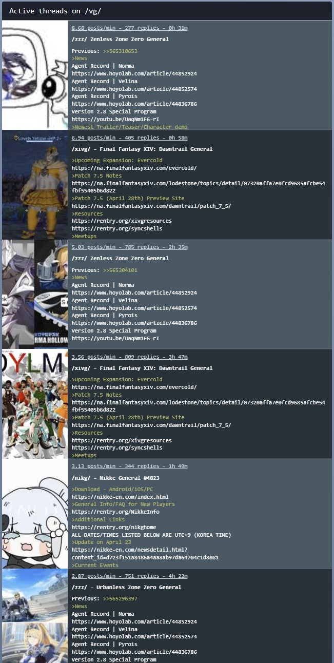 Previous: >>565310653>NewsAgent Record | Normahttps://www.hoyolab.com/article/44852924Agent Record | Velinahttps://www.hoyolab.com/article/44852574Agent Record | Pyroishttps://www.hoyolab.com/article/44836786Version 2.8 Special Programhttps://youtu.be/UaqNm1F6-rI>Newest Trailer/Teaser/Character demohttps://youtu.be/ew9nVnCl8AY (EN)https://youtu.be/L5DEAV17cYY (JP)https://youtu.be/tN0ibny9Ans (EN)https://youtu.be/25vaOHfSDUY (JP)https://youtu.be/7FbKuJv0e1I (EN)https://youtu.be/rBgqwLdtX-I (JP)>Upcoming Events for 2.7https://zenless.hoyoverse.com/en-us/news/163253Chronicle of Simmering Flavors 03/25 - 05/05All-New Program 03/24 - 05/05Special Disaster Control Squad 04/03 - 04/20Old Friends, New Commissions! 04/15 - 05/05"En-Nah" Into Your Lap 04/15 - 05/05Adventure Footage Freeze Frame 04/22 - 05/05Charge! Battle Against the Negative Reviews 04/29 - 05/13Advanced Bounty: Area Patrol 04/10 - 04/15Data Bounty: Combat Simulation 04/29 - 05/04>Redeemable codes (claimable in-game or online)https://zenless.hoyoverse.com/redemptionZENLESSGIFTZZZCUTENESSZZZ27CHAMPIONZZZ28HERO>Resources and useful linkshttps://rentry.org/zzzlinkshttps://rentry.org/ZZZ-Friendshttps://rentry.org/ZZZ-Guilds>/zzz/ OP pastebin (use this if making new thread):https://pastebin.com/PzbMf13P