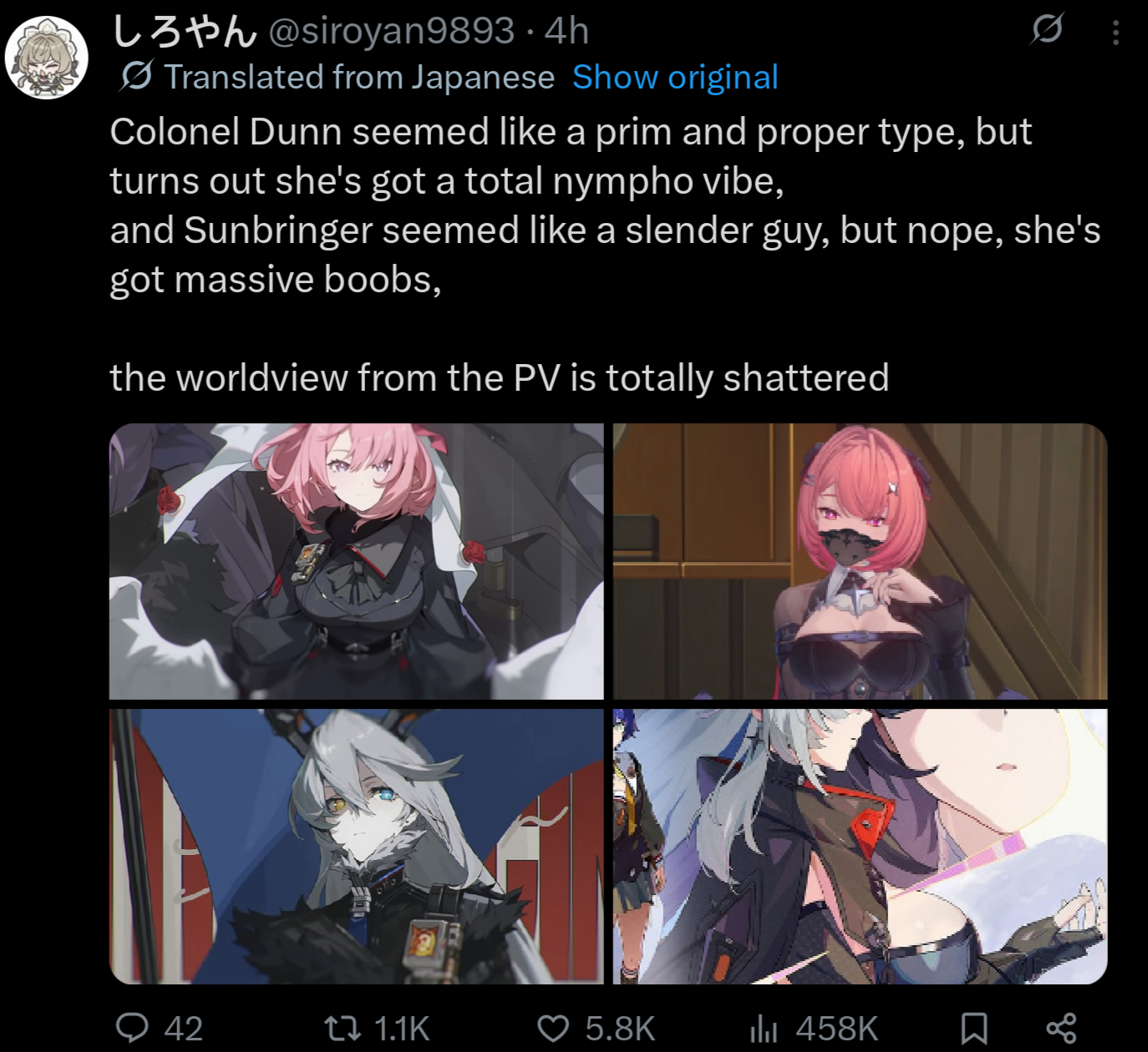 >>565318815>redesigned into goonbait titcow She's supposed to be a respectable figure. This is the exact same reason nobody took Yixuan seriously. Compare that with Miyabi with her dignified fit.