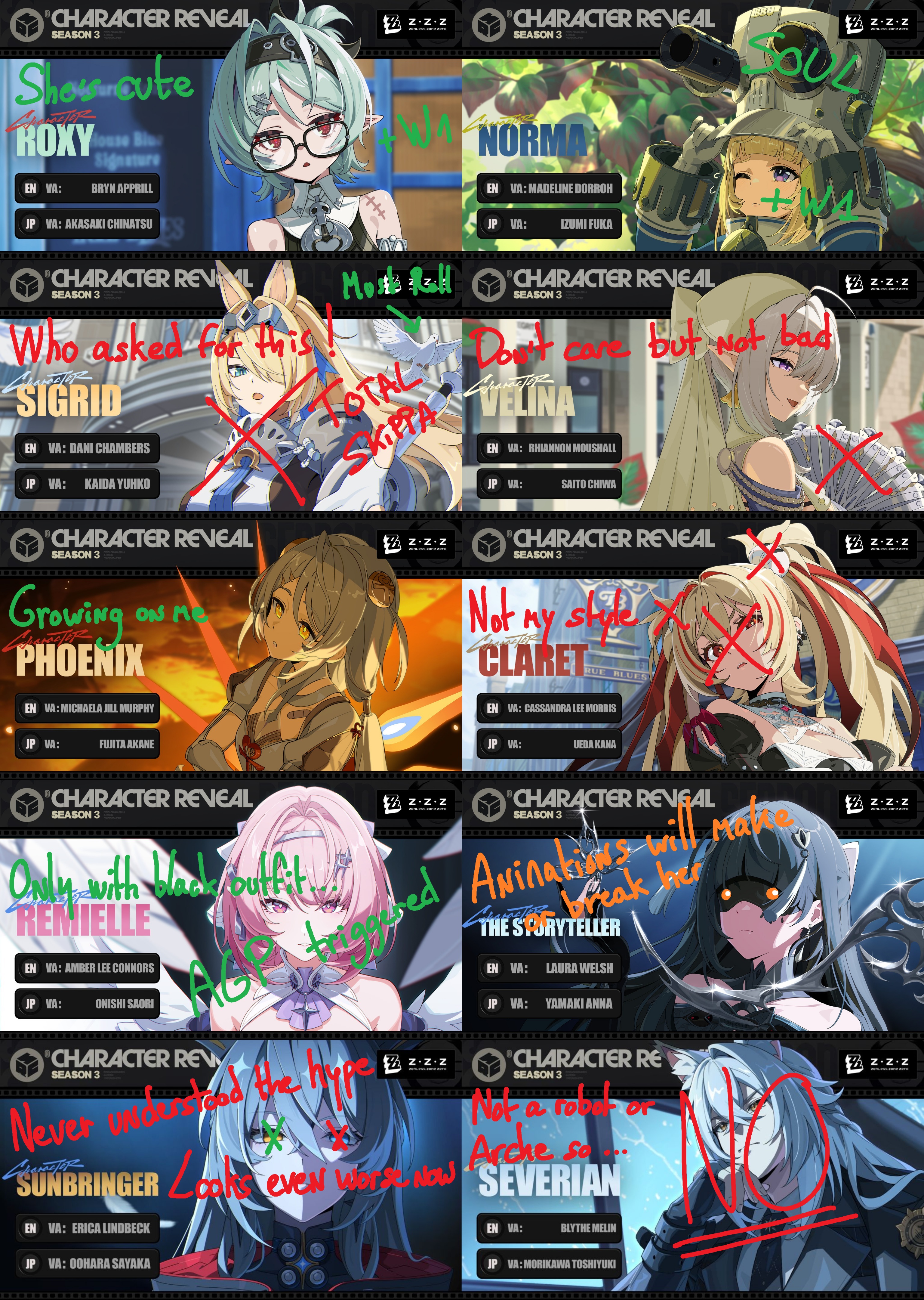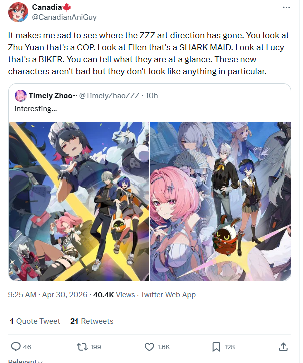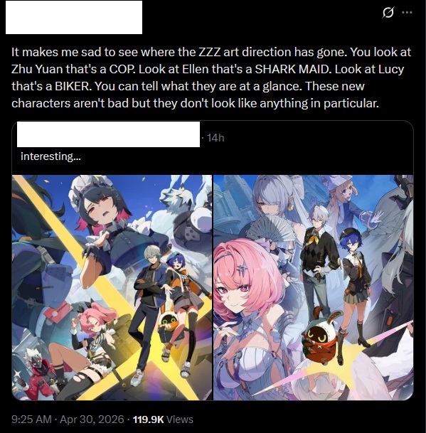 >It makes me sad to see where the ZZZ art direction has gone. You look at Zhu Yuan that's a COP. Look at Ellen that's a SHARK MAID. Look at Lucy that's a BIKER. You can tell what they are at a glance. These new characters aren't bad but they don't look like anything in particular.Is he right, /zzz/?