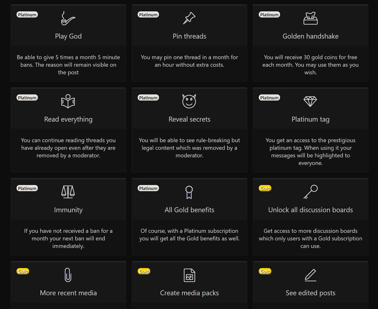 >>138722my main wishes are>doubled filesize limits>longer post character limits>maybe text formatting like on /qst/>>138814>play god>pin threads>immunityall would be great 4pass benefits>platinum tag>unlock all discussion boardswe already have theseComment too long. Click here to view the full text.