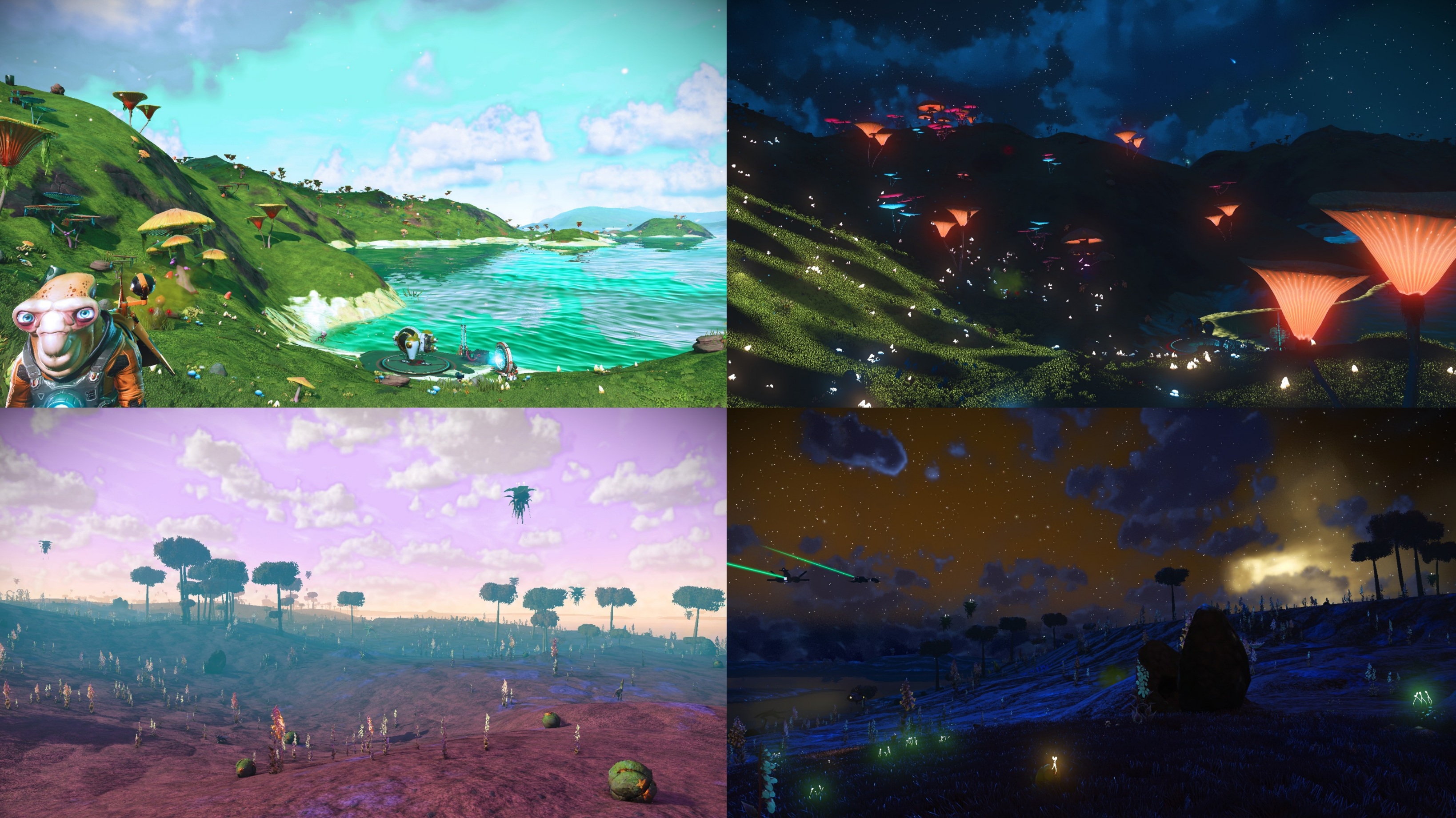I like this planet with green grass and glowing shroomsand this other one is really purple during the day with cool orange colors lighting up the night sky