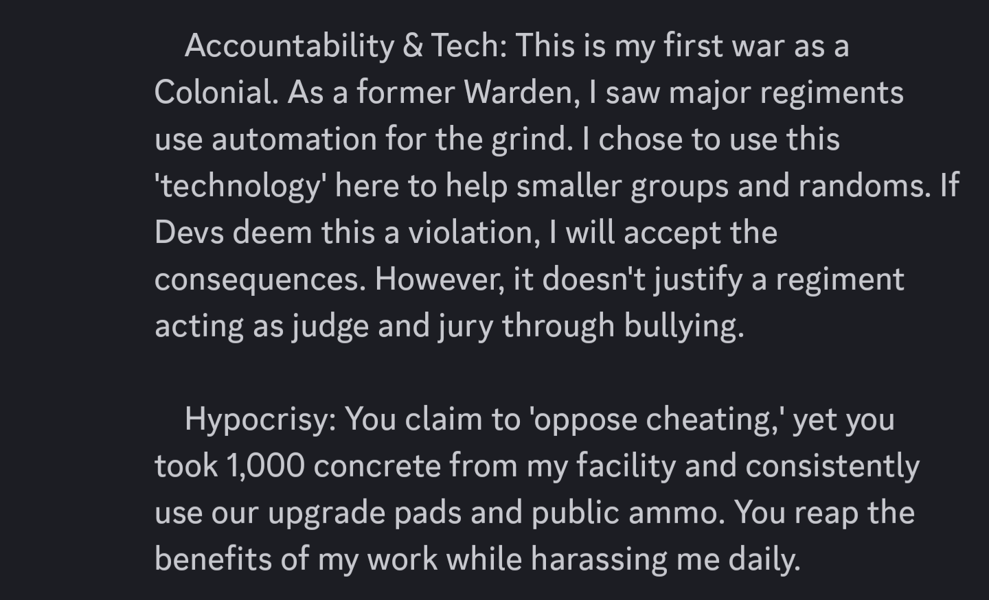 >one warden mega base this war requires 100k msupps daily>we're supposed to believe they're doing it legit despite the fact that they've been caught botting a million times beforeIt's really easy to spam lines and lines and lines of conc'd metas and ammo fac's when you don't have to worry about upkeep. Devs should compensate colonials for all the warden cheating by giving us millions of msupps.