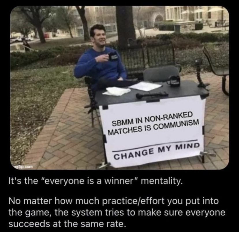 >SBMM promotes “total fairness” where everyone ideally goes 1 - 1>SBMM normalizes the idea that everyone should have the same rate of success — regardless of effort or practice>SBMM demoralizes the player by preventing the player from having amazing games. Amazing is offensive. An amazing game for you means other people didn’t have an amazing game. That’s not fair! You MUST go 24-22 on average.Companies claim SBMM is good for engagement, but games had way more concurrent players back before such strong SBMM was the norm. SBMM is a political statement. It’s a form of control. It wouldn’t surprise me if the elitist pedophiles mandated that all major game companies include SBMM in their competitive games.