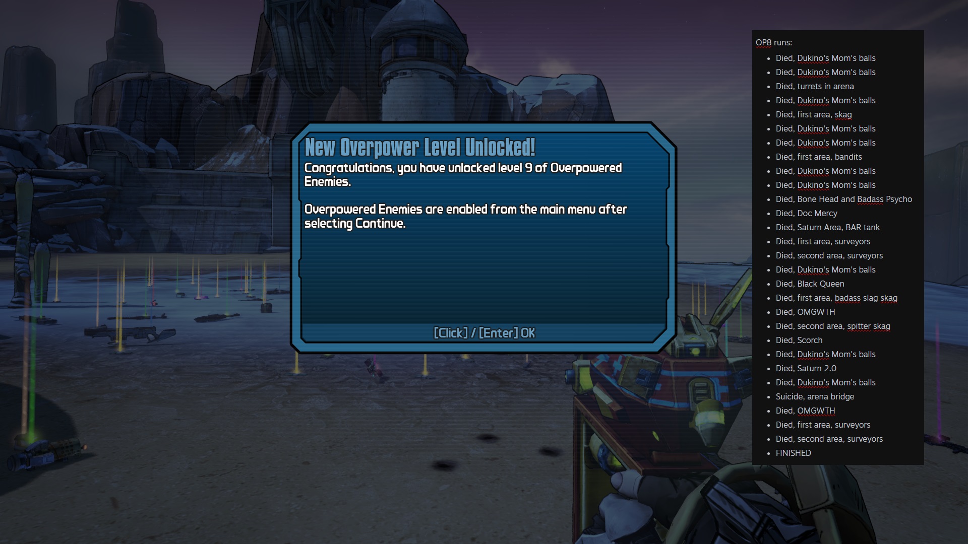 Finally beat OP8. Spent a while putting it off because I really hated facing Dukino's Mom. But I decided I needed to get over it so I went and farmed a new OP8 DPUH with matching grip, a new Electric Chair, and dug out an old lv 50 Rubi from storage so I can actually heal through her stupid ball barrage. For everything else, I just needed a new OP8 Bee and OP8 Topneaa so I spent a few days farming the Haderax chest for a good Topneaa with fire rate and reload speed. It's amazing how much damage an on-level Topneaa can do. I never knew it existed back in the day, only thought the Norfleet was the only rocket launcher worth caring about. I was so uninformed back then...Final boss gave me some grief because he had deflector plates on his legs or something that nobody ever mentions, so I kept killing myself with acid the first couple times because of it. Played ultra-conservative on the final try where I had no line-of-sight to him and got him. It still feels unreal that I managed to beat OP8.Before I finally beat it, I spent a good while despair-watching Youtube videos of other people's Gaige Peak runs and they all just breezed through it with Norfleets and Twisters so I was on the verge of farming for them just to have a chance at beating the Peak. Thank goodness I didn't give in (yet). I'm guessing I'll be fine with OP9 once I get a new set of DPUH + Bee + Topneaa. Then I'll be FINISHED. I might reach OP10 before the end of the year!!Hope things are going well for any other BLbros still playing.