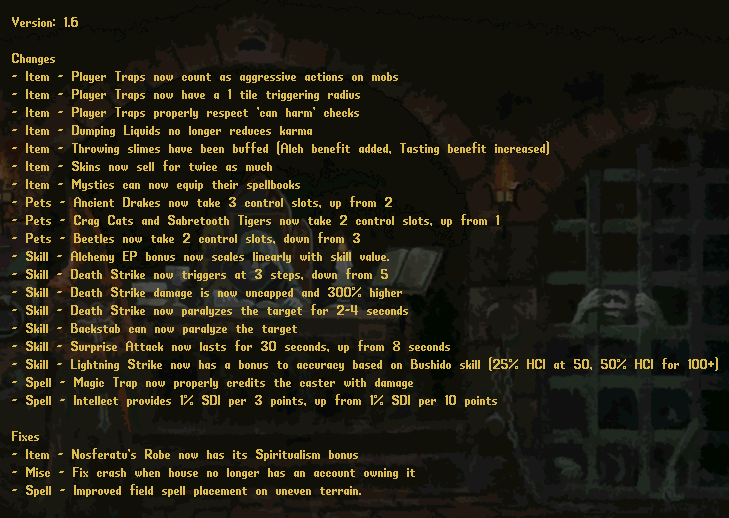 The dungeon invader system is live on the UO server. >When a player is in a dungeon, there's a chance a red NPC will spawn near their location and hunt them down. >I'm not going to explain exactly how the system works, but for each player it should average out to 1 invasion every 4 hours spent in dungeons. >After an invasion you can't be invaded again for 1 hour.>The player being targeted receives thematic messaging when the invader spawns in the dungeon.>The invader's stats, skills, gear and loot scale with the player's stats and combat skills.>There are several different skill and gear templates for the invaders.It really adds to the suspense of dungeon crawling, capturing some of that fear of PKs on a typical UO server. They'll even taunt you while you fight and celebrate if they manage to kill you. Not to pat myself on the back too much, but it's a pretty slick system.