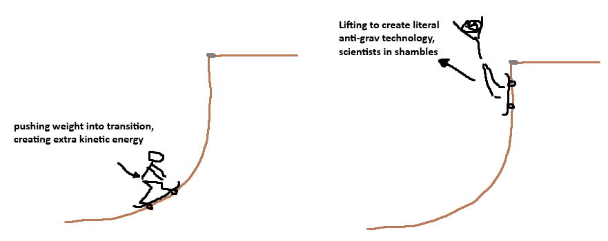 >>2119083its just physics, you can feel it out.you probably do it naturally to a certain extent, unless you are still at the level where any ramp makes you throw your arms up, lean back, and smash yourself into the floor. you sort of push your weight down into the board and into the transition, then lift to make yourself light as it flattens out - whether thats the vert/top of ramp on the way up, or the floor on the way down.it's a little bit like being on a swing, the way you push weight down through your butt to get momentum, then throw your legs up to lift into the air. riding miniramps is great practice, just keeping momentum whilst doing rock to fakies back and forth. obviously it's a bit different carrying the momentum to air over coping, but same basic principle.