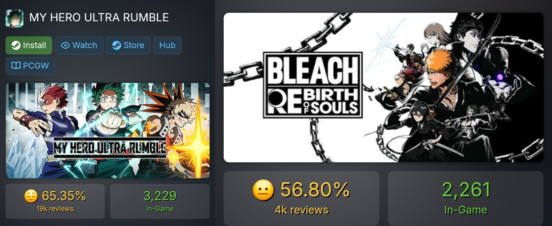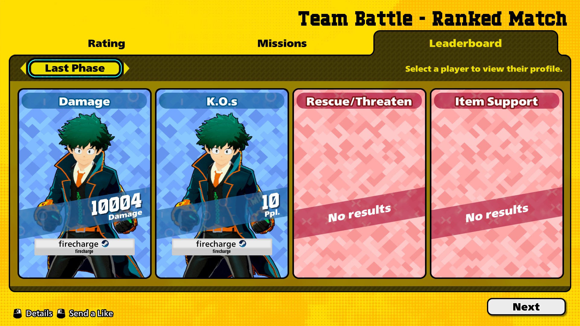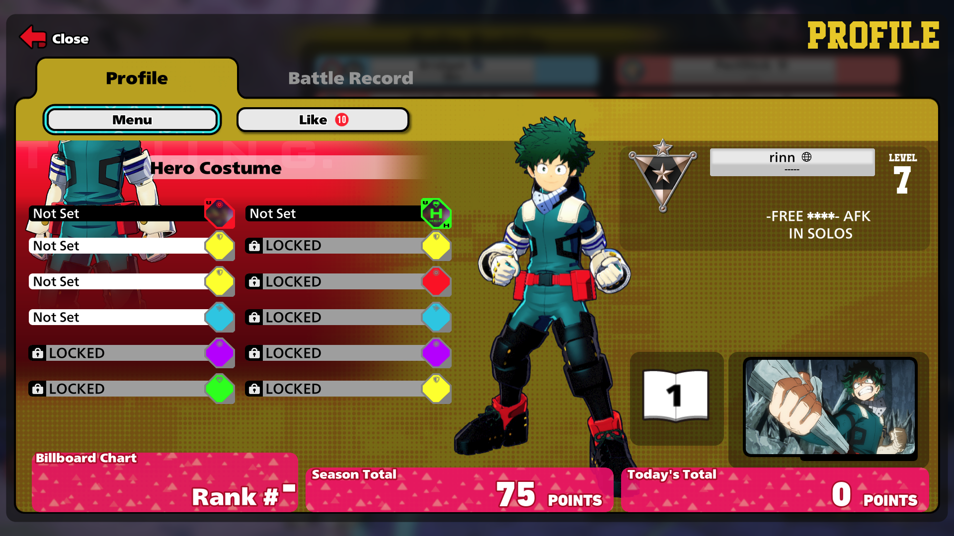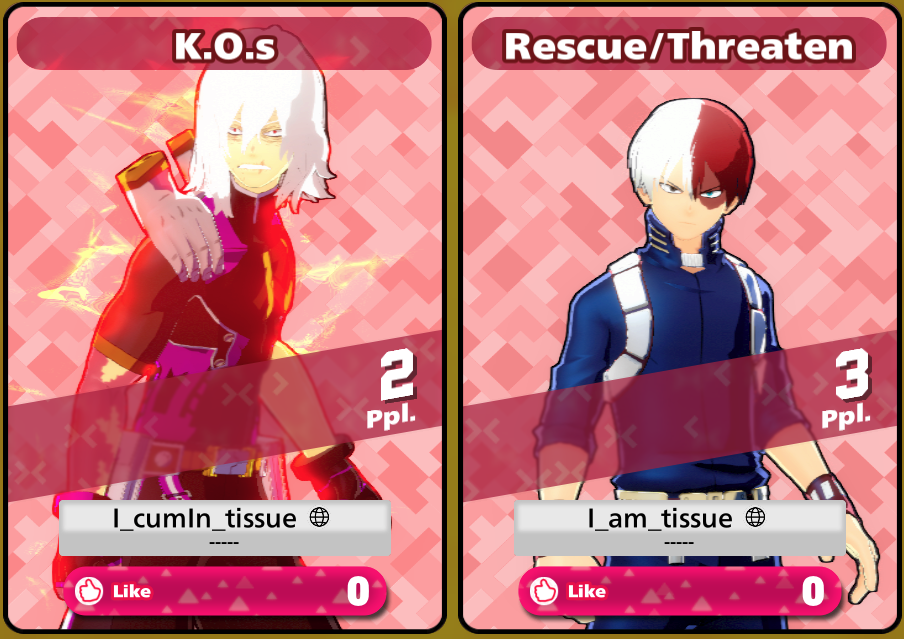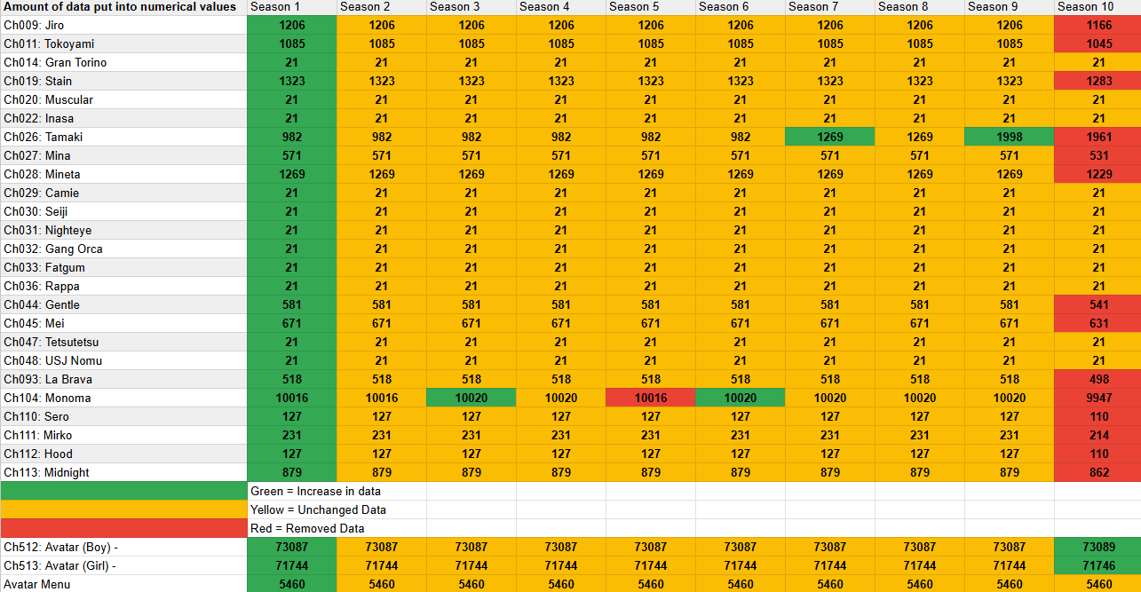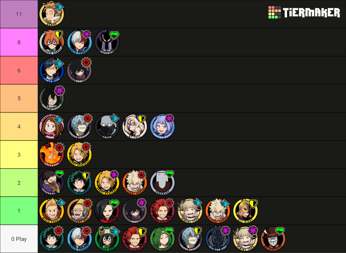 Out of curiosity, I went through the Top 100 players on PC and tallied up their current characters. There's no accounting for skill sets/people not playing their mains at the moment, but I still think it's interesting.At time of writing, there are:19 Deku11 Shinso8 Ochako6 Hawks5 Iida4 Shiggy, Kendo, Bakugo, Aizawa, and Momo3 Cementoss, Kiri, Denki, and All Might2 Shoto, Mt. Lady, Toga, Mic, Dabi, Froppy, and Endeavor1 Kurogiri, AfO, Overhaul, Twice, and Nejireand 0 Mirio, Compress, and Ibara.I guarantee most of those Dekus are Strike. Even after his nerfs, Deku remains king at the top of the meta. Though at least a lot of the general playerbase seems to have diversified more.