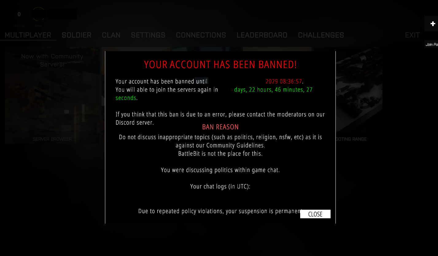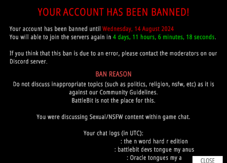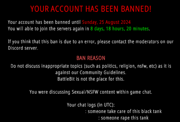 Has anyone else been banned from Battlebit? How does their ban system work; how do I get around it? I know that to appeal a ban you have to do it through their Discord server, but that's kinda gay. I played the game for like a month or so and then got permabanned.It's a good--fun--game, but I don't think I'll go ahead and buy another copy on an alt. Especially not considering the fact that the devs haven't put out an update in a little over a year. Unfortunate since I'm a big Battlefield fan, and I think they really had something over Battlefield with respect to certain mechanics, but also had their own niche of being what most would describe as an "arcade mil-sim". What are the chances I can just say "uh, that wasn't me, that was my friend spamming nigger nigger nigger XD"? I never used the nigger-word in-chat, so I don't know why I got banned; I always restrained myself from going chud moad. I read some of the EULA, and it states--from what I remember--that I am not allowed to sell my account. So that means saying that I bought the account off someone and they scammed me by neglecting to mention that they were banned is off the table--that is unless they personally review the case and it isn't just automated for the most part.Anyway, after I get my ban appealed, does anyone want to play Battlebit together. I play either as medic or sniper, but I can play support if you'd like too. We can also just go around running people over.