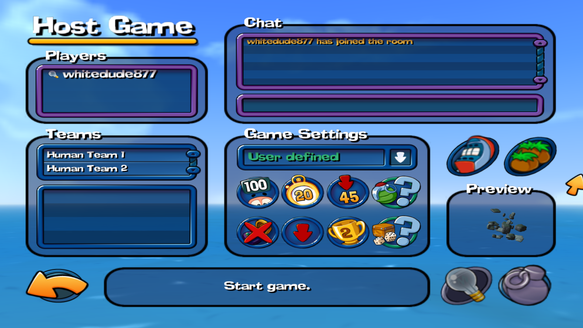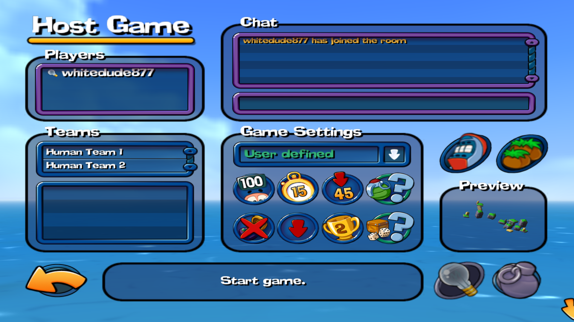 test scheme: Interleetiaterandom spawn5s hotseat25s turns3x power 3 ropes1 holy and 1 aqua sheep on delay, no team wepspoison SD, medium water riseplay with 6 worms on island or cavehttps://files.catbox.moe/z4ktri.wsc