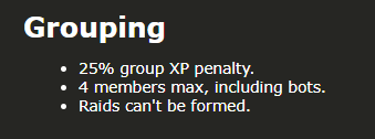 SoloQuest:>Added a 25% group XP PENALTY. This is the tradeoff for the added safety of having a bot in your group. Risk vs reward is the name of the game.>Bots can no longer be invited to a group while in combat.