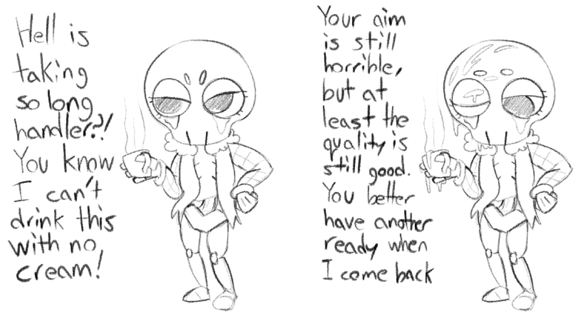 >>1980979>More time passes, and most of the hanlders are mingling, eating, or relaxing>You let Vee think in peace, just spending your time doodling casually>Then she speaks up, seeming to have a realization, turning to you with a cheeky smile>"Hm... Anon, I don't think there's enough chairs here for me to sit down!">You noticed that too, but you assumed it was intentional>"You're right, what's the deal with that?", you ask>In return, she nonchalantly shrugs, "Dunno, guess they made a mistake.">"That's fine though, I think I know what to do.", she looks to you mischievously>Then, she climbs up into your lap>"Uh... Vee, I don't know if that's...", you try to reason with her, slightly pleading>You're hoping this isn't going to go where you think it is