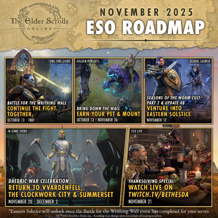 Zone Event edition>Writhing Wall event (starts October 13)https://www.elderscrollsonline.com/en-us/news/post/68785>Golden Pursuit (Battle for the Writhing Wall)https://www.elderscrollsonline.com/en-us/news/post/68787>Crown Store Showcase - October 2025https://www.elderscrollsonline.com/en-us/news/post/68771>Elder Thread>>1947743>ESO Server Statushttps://esoserverstatus.net>Latest ESO Livetwitch.tv/bethesda>Places to Buy/Recommended Addons/Assorted Links/Tweakspastebin.com/BuD9GaGX- There are occasionally Free Play Events for prospective new players.>UI Addonsesoui.comminion.gg>/tesog/ Guilds[PC NA] mail: @taeralis, @zsj[PC EU] mail: @zsj, @Boggus, @NovaPixelOr post your @username/platform/location here.>Do I need to subscribe?Optional, with largest benefits being access to all DLC (but NOT the 2025 Content Pass/Solstice), cash shop currency on sub start/renewal, and the Craft Bag (can save your characters a ton of space).>Which faction should I choose?Want to PVP in Cyrodiil with friends? Make sure you're in the same faction. Otherwise, doesn't matter.>Where should I begin normal questing?Check out the OG beginner stuff, first: go to Port Hunding, Khenarthi's Roost, or Bleakrock.>Pledge/Trial Calendarbenevolentbowd.ca/calendar/eso-pledge-calendar-en/>DLC Chronological order flowcharthttps://imgur.com/a/1FqzvH1>The More You Know- Level Rewards give you tons of stuff along the way, including a free mount at level 10.- You need to be at least CP300 to queue for vet DLC dungeons.