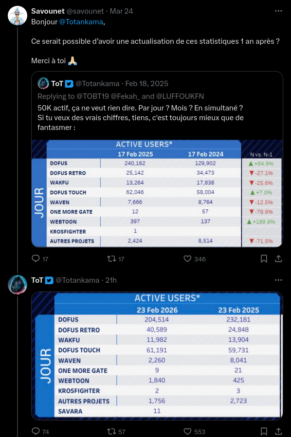 >Recent NewsNew Wakfu seasonal servers opening Nov 10~13: https://www.wakfu.com/en/mmorpg/news/announcements/1765509-neo-server-faq-your-questions-answeredDofus Osavora update: https://www.dofus.com/en/mmorpg/news/update/1764407-osavoraDofus Infinite Dreams revamp: https://www.dofus.com/en/mmorpg/news/devblog/tickets/1764730-well-infinite-dreams-part-2>DofusDownload: https://www.dofus.com/en/mmorpg/downloadGuides: https://pastebin.com/aqfxZywY>Dofus RetroDownload: https://www.dofus-retro.com/en/mmorpg/downloadGuides: https://pastebin.com/EnGbaLMz>WakfuDownload: https://www.wakfu.com/en/mmorpg/downloadGuides: https://pastebin.com/Ae7X8phu>WavenDownload: https://www.waven-game.com/en/download>Savarahttps://store.steampowered.com/app/3021630/Savara/https://www.ankama.com/en/games/savara>One More Gatehttps://store.steampowered.com/app/1832950/One_More_Gate__A_Wakfu_Legend/https://www.ankama.com/en/games/one-more-gateIn a previous episode: >>1852869Is gookmoot trying to kill /vm/? edition
