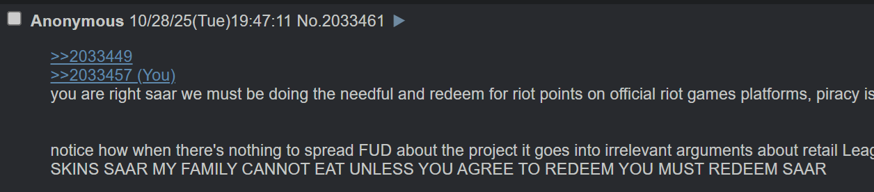 >>2033449>>2033457you are right saar we must be doing the needful and redeem for riot points on official riot games platforms, piracy is bad for our karmanotice how when there's nothing to spread FUD about the project it goes into irrelevant arguments about retail League being better lol, but now it's oh some guy hasn't shown up in a couple of weeks FEAR UNCERTAINY PANIC DOUBT IT'S DEAD IT'S DEAD PLEASE GO PLAY RETAIL PLEEEASE BUY SOME SKINS SAAR MY FAMILY CANNOT EAT UNLESS YOU AGREE TO REDEEM YOU MUST REDEEM SAAR
