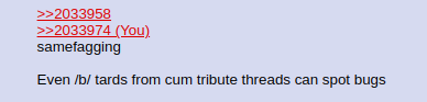 >>2033958>>2033974samefaggingEven /b/ tards from cum tribute threads can spot bugs