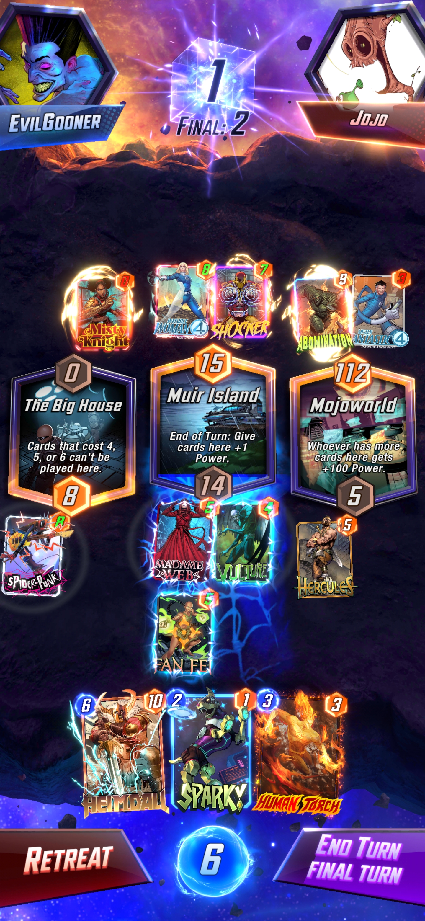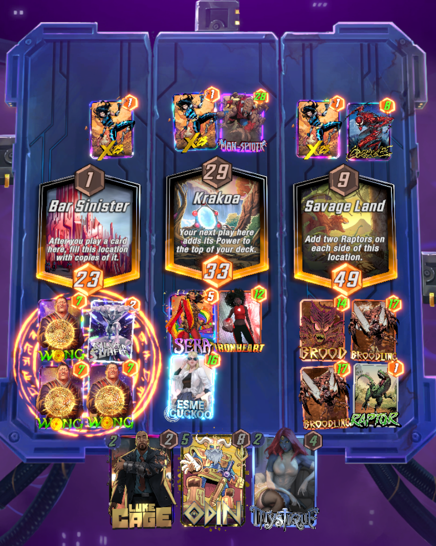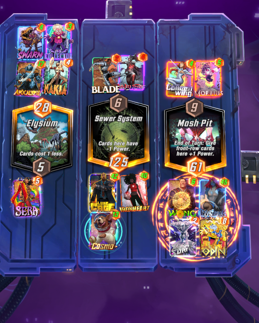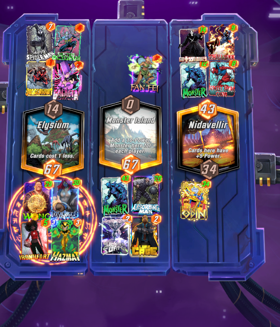 >wong/mystique/ironheart/odin goes off>none of it gets fast forwarded>opponent plays juggernaut without priority and moves my odin, then plays doctor ocotopus to pull my hazmat>another round of wong nonsenseLongest turn 6 ever holy shit lol