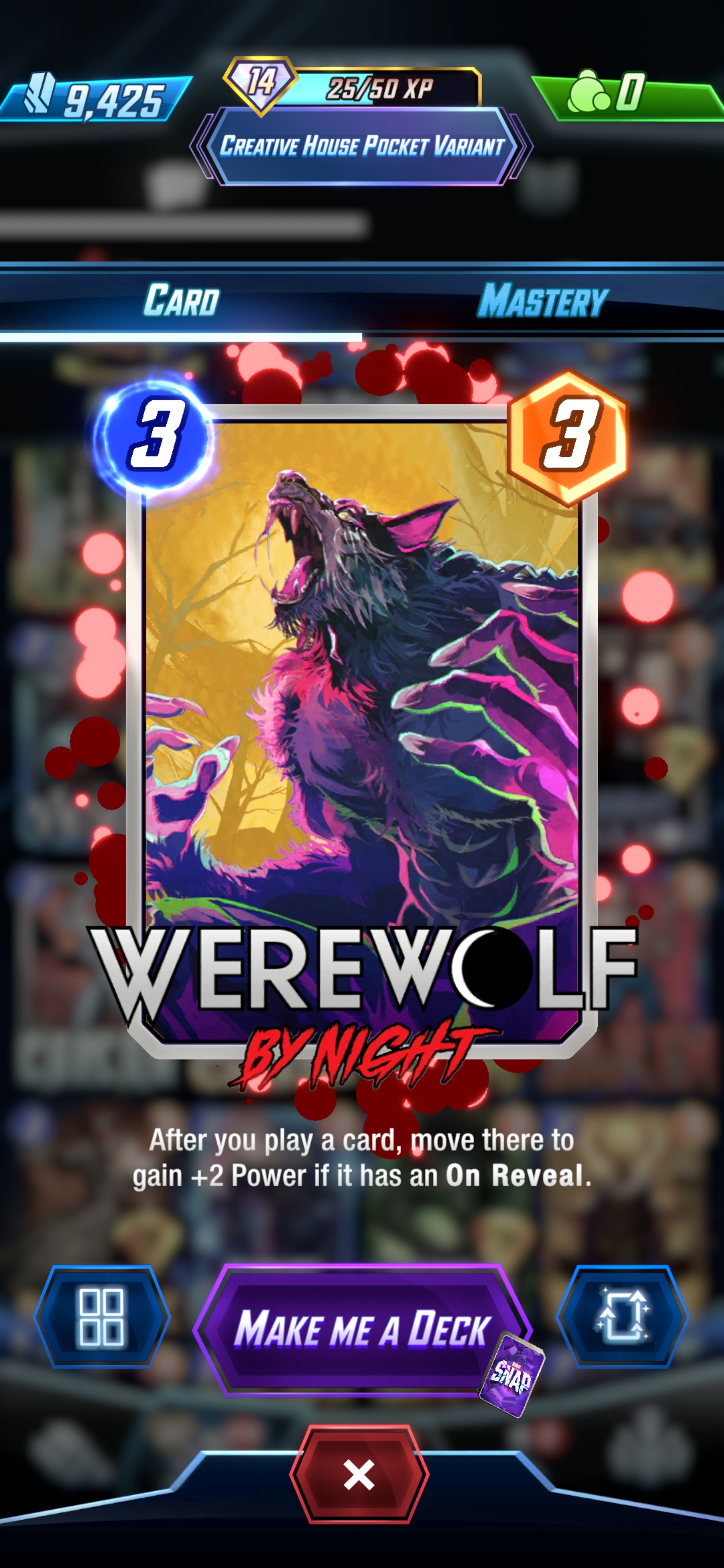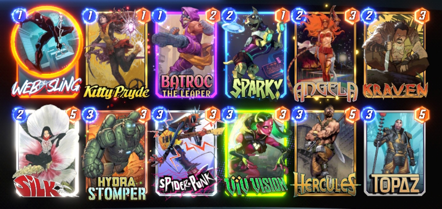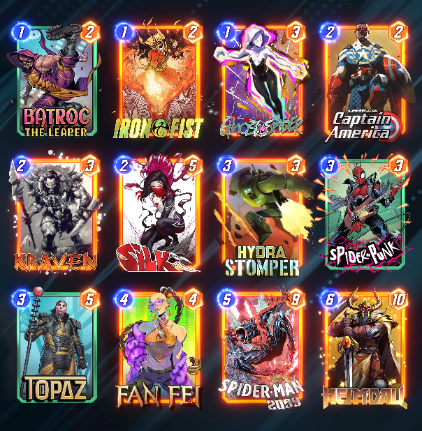 Issue #288 - Web Wankers Edition>Official Site and Discordhttps://www.marvelsnap.com/https://discord.com/invite/97HFh4BXe8>Basics (Tutorial & Collection Progression)https://www.marvelsnap.com/howtoplay>Collection Trackerhttps://marvelsnapzone.com/collection/>Resourceshttps://snap.fan/decks/meta/https://marvelsnap.pro/meta/https://marvelsnapzone.com/metagame/https://twitter.com/SnapDecks>FAQ>What is Marvel Snap?The GOTY CCG from the creators of Hearthstone. A deck is 12 card singleton. Players play 6 simultaneous turns to 3 lanes. Winning 2 lanes wins the match. Matches are played for ladder ranks (cosmic cubes) and players can SNAP once per match to double the stakes (max 8 cubes).>What is a card series?Cards unlock in a random order, but specific cards are unlocked within specific collection level (CL) ranges: Series 1 cards (CL 18-214), Series 2 (222-474), and Series 3 (474+). Series 4 (Rare) and 5 (Super Rare) cards can be purchased directly with Collector’s Tokens that can also be used to buy Series 4 or 5 Snap Packs that are cheaper but dole out random cards from certain pools.>How can I increase my CL faster?Upgrade every card you get to green rarity (frame break) ASAP. Spend the rest of your credits how you like.>When should I snap?https://marvelsnapzone.com/the-ultimate-snapping-strategy-guide-for-marvel-snap/>Whose cards reveal first?The player who is currently winning reveals first. Otherwise at random. The player revealing first has a glowing portrait.>What should I spend my gold on?Variants and bundles with tokens.Official /snap/ Alliances: [VGS] /snap/, [VGS] /snap/'s Revenge, [VGS] /snap/'s Step SisterOnly requirement? Be active.>Comic Recshttps://comraderecs.tumblr.com/post/18865607172/marvel-comic-recommendationsPrevious: >>2004629