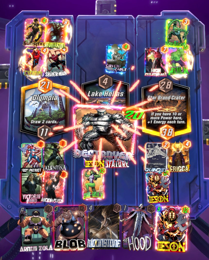 seems like the best brew with HS and SP I managed to pull outEasily steals 2 locations with ~35 powerAlso, SP seems broken. Often it ends up at least 3-7 (so, 3-11 which is insane)There are possibilities with Hellion and Xorn routes but I didn't figure out good replacements for those.