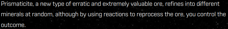 >>2059014My original assumptions based on the test server: The new ore is absolutely worthless, needs too much effort to mine, doesn't refine into enough ISK/hr to chase over spawning asteroid anomalies in your back yard where you can easily exploit them. Assuming all mineral types have an equal chance to appear from a refine, the price of the ore will settle somewhere around Arkonor, and most of the reactions don't even turn ISK positive after the reagent costs.If those numbers are just placeholders though and the ore turns out to be worth even more than Pochven ore, it'll probably become a major part of the mineral supply. I think people will probably still mine real easy to get anomaly spawns for something to do, but prismatic ore will inject so many minerals into the economy that most other forms of mineral mining will be worthless. Like you won't need to use those asteroid spawner upgrades in null and high sec asteroid and moon prices will drop significantly. I don't think LS and WH mining can get any more dead than it is though.