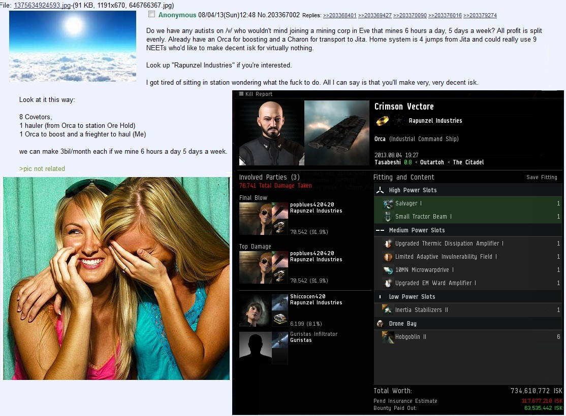 >>2111589We've been over this a few times. Eve is a game all about you and your character's reputation. 4chan is a place where everyone is anonymous. These arent compatible. Also everyone here already has their own corps/alliances they fly with, why would anyone drop everything and spend days/weeks moving shit to hang out with a bunch of random retards from 4chan? pic relatedThe closest we got was a 10-man corp that was shilled by a Youtuber that did nothing and went nowhere.