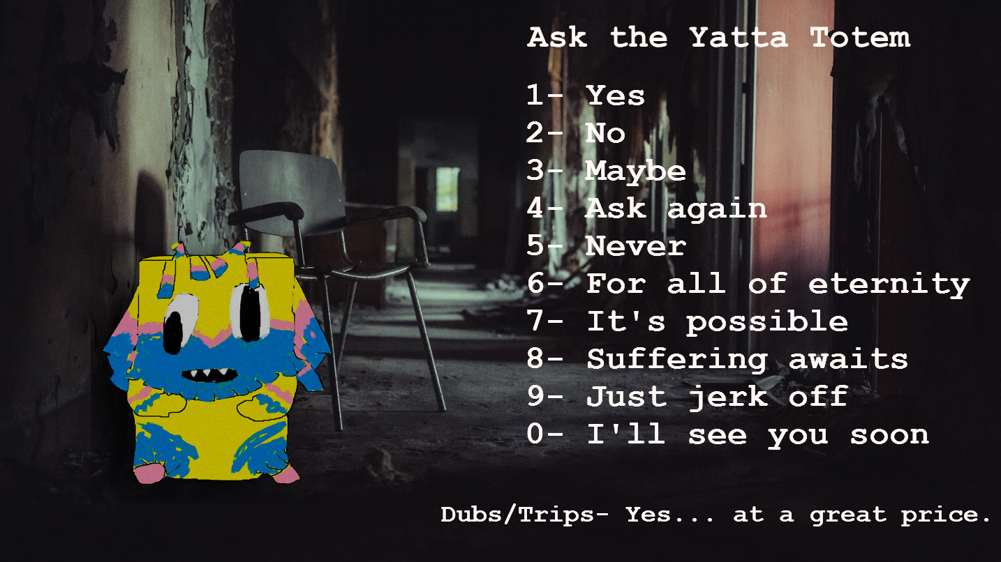 OHHHHHHHHHHHH GREEEAAAAT YATTA TOTEM!!! I SUMMON THEE TO ANSWER OUR QUESTIONS!!! AND ALSO TO FUCK SPECIFICALLY WITH THAT YATTA SIZEFAG GUT BECAUSE IT'S FUNNY!!!!