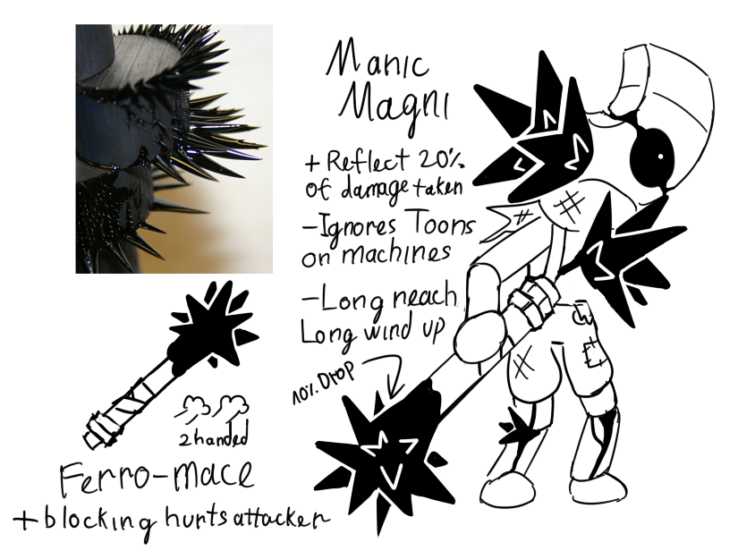 M.Magni is an early game enemy equivilence to boxten , I cannot have him do 100 different thingsKeep designs bold , tiny details are completely lost on player being chased/view from distance if anything clutters are hard to look at.MMagni spikes is based on ferrofluids as concept.You can refer to the concept art post for his abilities.