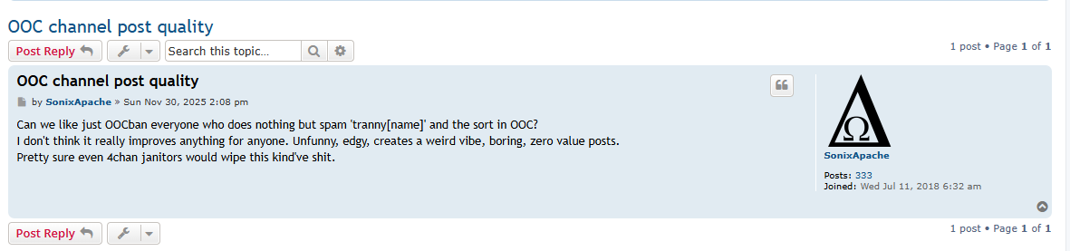 >Can we like just OOCban everyone who does nothing but spam 'tranny[name]' and the sort in OOC?>I don't think it really improves anything for anyone. Unfunny, edgy, creates a weird vibe, boring, zero value posts.>Pretty sure even 4chan janitors would wipe this kind've shit.