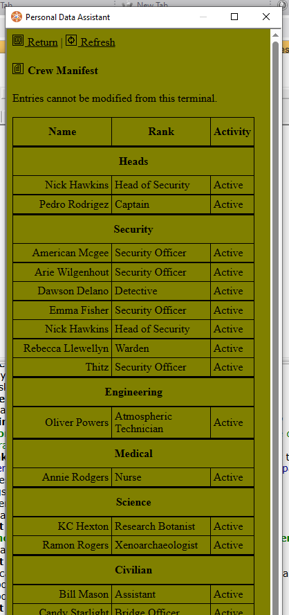 >>2091772Admins dont realize that micromanaging like this kills off any expectations for security to do its job and arrest rulebreaking crewmembers. I've never seen security go after anyone but antags on modern hub servers because of this, nonantags are just too scared to do anything criminal. Thanks for sharing Isaac.