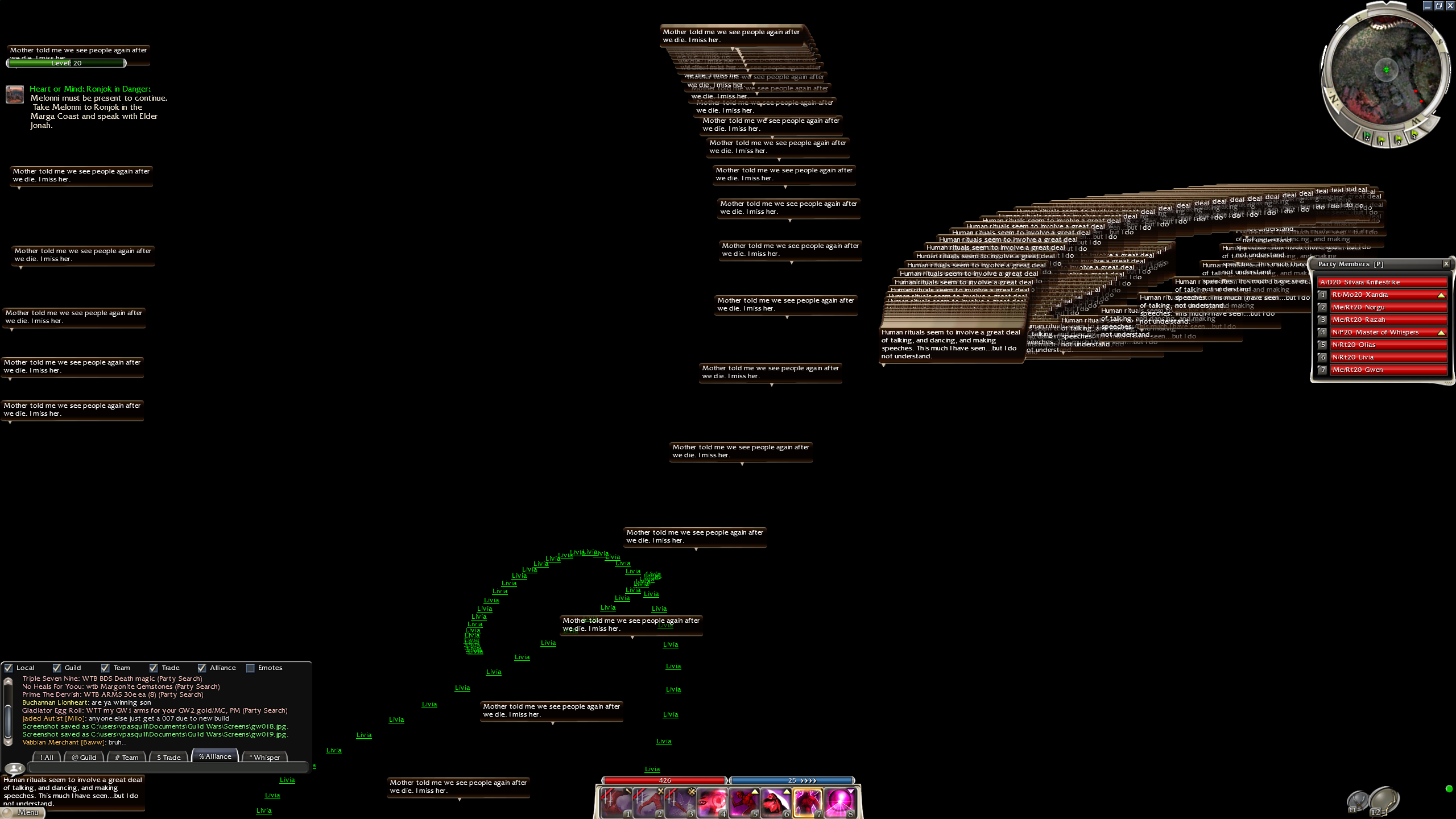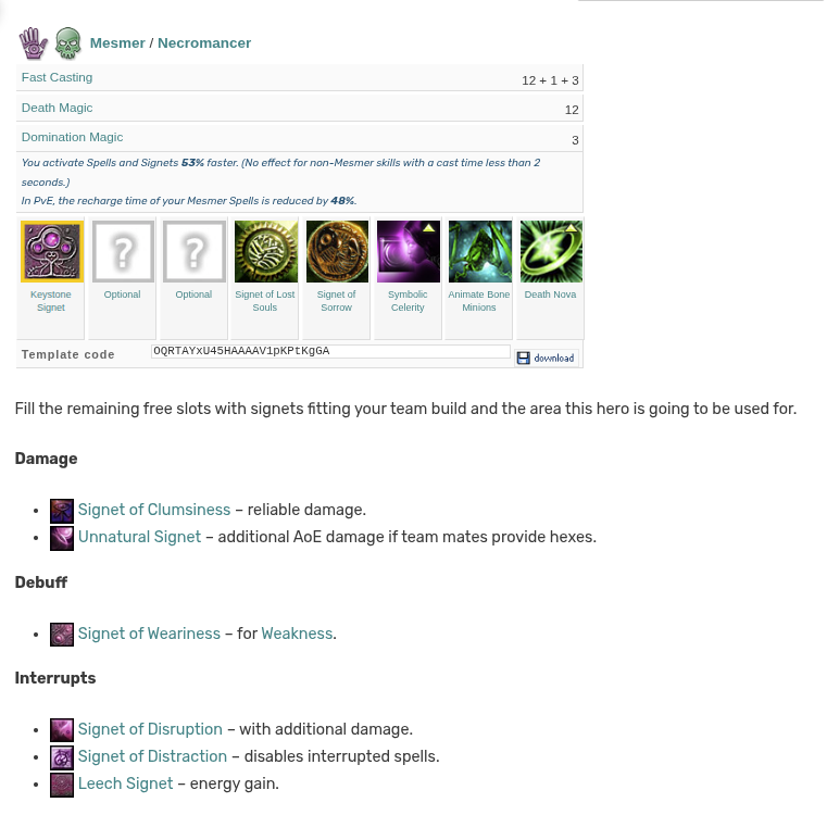 >>2086956If you are new to the game getting heroes will hurt you more than help you because you will not have any skills to put on them and some people can find it overwhelming to try and learn how their own profession + multiple other professions work all at the same time. I would go back to original campaign>>2086917Need to find Marcus's old factions Rt/N AotL build. You can use Explosive Growth to make your minions do AoE damage when they spawn. This skill works with Jagged bones as well so they die and trigger death nova, and then jagged bones triggers which triggers Explosive Growth for more damage.I would run Mindbender so you can cast Death Nova + Jagged bones 20% faster. You may want to even consider running a Fast Casting mod so you can cast death nova even faster. If you are running boon of creation you should have plenty of energy.