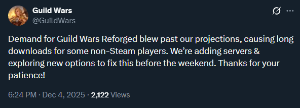 https://x.com/GuildWars/status/1996722265573199948"Demand for Guild Wars Reforged blew past our projections, causing long downloads for some non-Steam players. We’re adding servers & exploring new options to fix this before the weekend. Thanks for your patience!"Honestly kinda crazy, it was only a few years ago that Stephen revealed that between 2018 and 2022 the game population had tripled and they had to increase servers, but even that's not enough for the returning players now.
