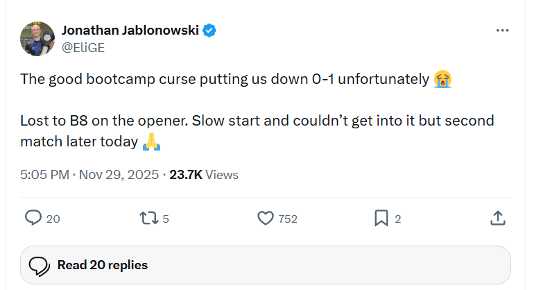 >midrora CEO bragging about barely getting into stage 1 over G2 a week before the cutoff>get fucked over by head-to-head calculations at the last second>about to exit 1-3 like falconsdisband before the game is finished?