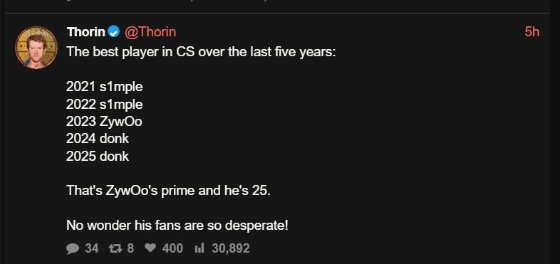 >>2162772ZywOo lost bro. Twistzz > mezii proves it.. I'm a ZywOo fan too bro but we have to accept reality now. donk is just too good individually