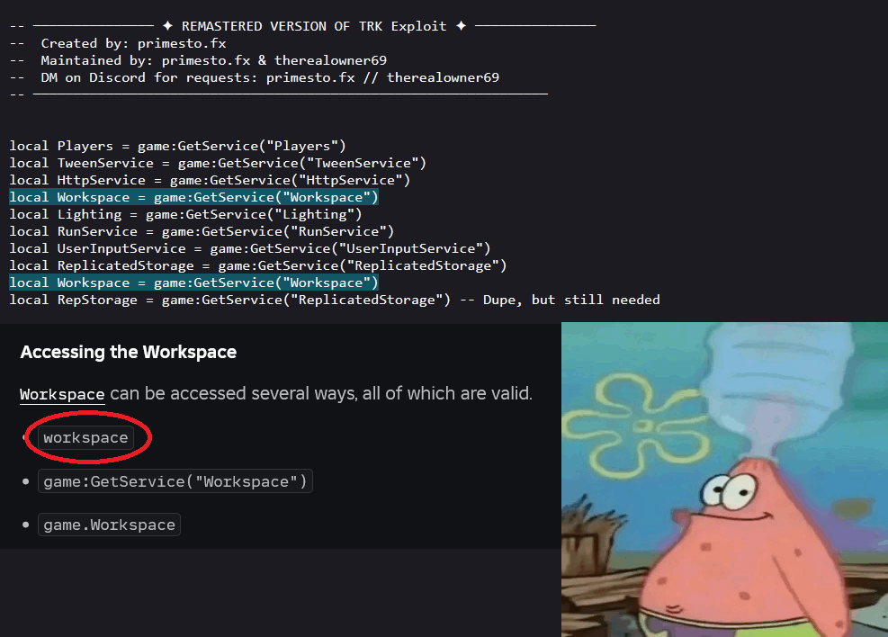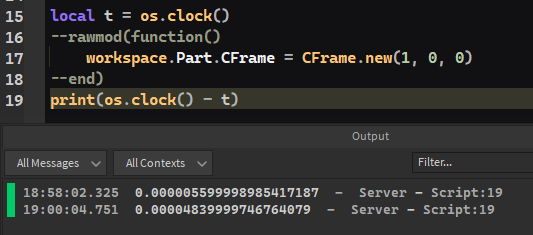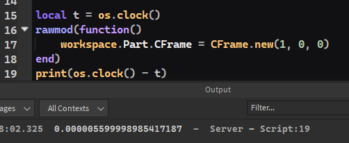 >>2143797there's a recursion depth limit, I don't know why but it works. this error in picrel only occurs if there is any function connected to any event of that instance, but it doesn't stop the code from running.you use the function like this:rawmod(function() workspace.Part.CFrame = CFrame.new(1, 0, 0)end)make sure to leave the second parameter (n) undefined when calling the function.this is only really useful if there's a fuck ton of objects you're changing the CFrames of like 10s of thousands or so