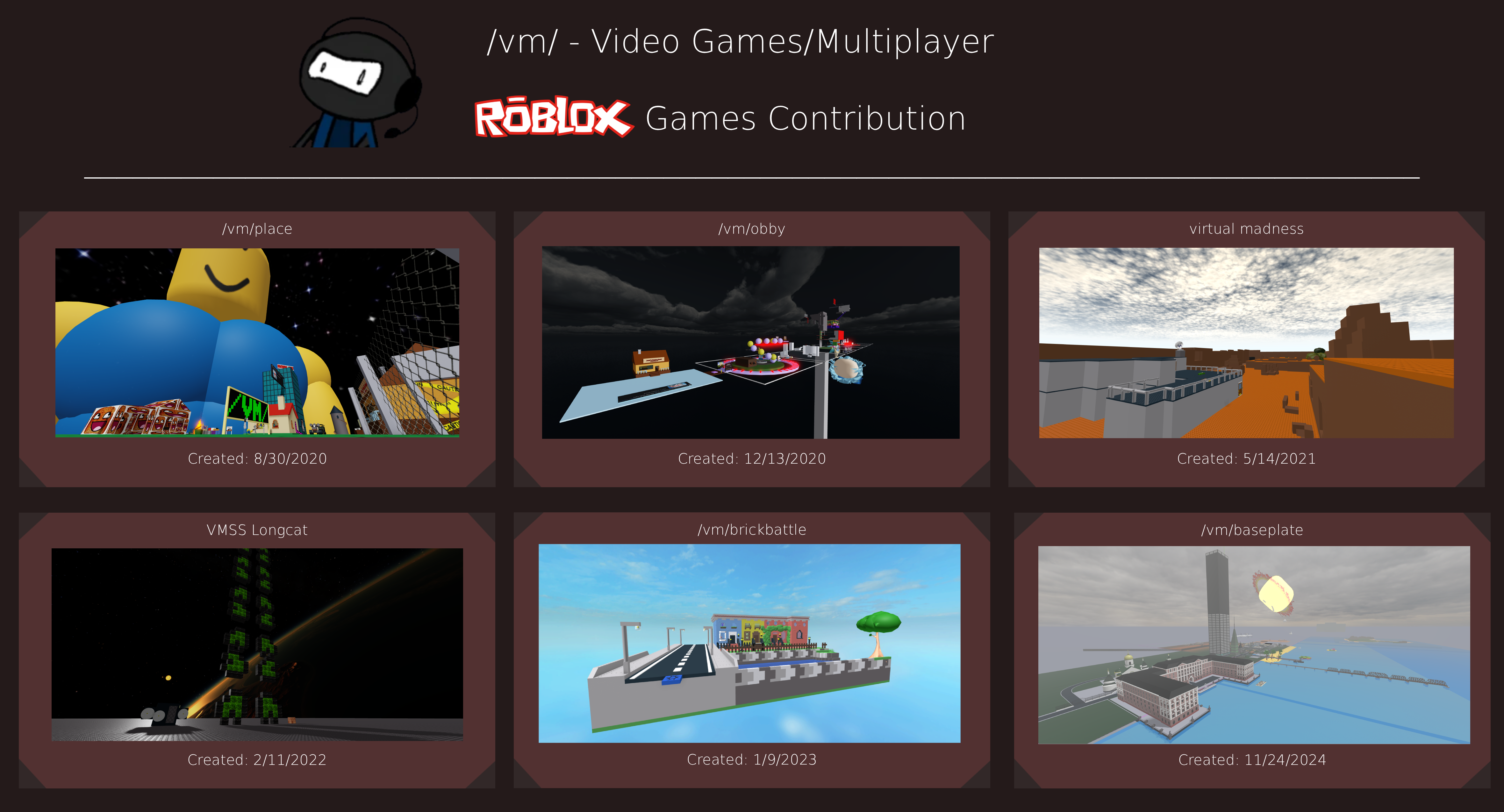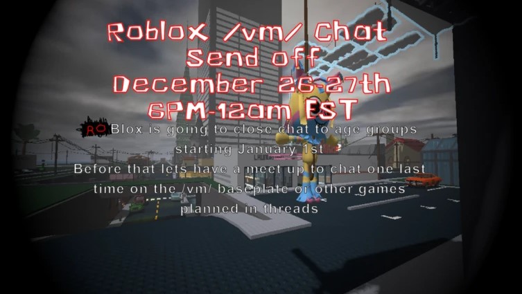 In the latest news, you'll need to verify by doing a facial AI estimation age check or send ID to able chat and collaborate with each other in ROBLOX Studio. There will also be a requirement to spend money for ROBLOX Studio to publish changes in early 2026./vm/baseplate meet-up will begin at the following times below (the link will automatically convert the meet-up time to your timezone).12/26/2025 6:00PM - 12:00AM EST12/27/2025 6:00PM - 12:00AM ESThttps://www.roblox.com/events/246525605795594921What is ROBLOX?Roblox is an online game platform and game creation system developed by Roblox Corporation that allows users to program and play games created by themselves or other users as long as they forfeit all their personal information to them.>Building Resourceshttps://archive.org/details/vitruviustenbook00vitruoft/mode/2uphttps://archive.org/details/FrancisD.K.ChingArchitectureFormSpaceAndOrder3rdEdition/mode/2uphttps://archive.org/details/TimeSaverStandardsForBuildingTypes/mode/2uphttps://www.youtube.com/@diesoft5243/videoshttps://files.catbox.moe/qf3ahg.pdfhttps://files.znu.edu.ua/files/Bibliobooks/Inshi72/0052538.pdf>Scripting Resourceshttps://lua.org/manual/5.1/https://create.roblox.com/docs/tutorials/use-case-tutorials/scripting/basic-scripting/intro-to-scriptinghttps://create.roblox.com/docs/reference/engine>Avoiding Tutorial HellTutorial hell is when someone spends excessive time following tutorials and not working on their creations. Focus on making something of your own instead of relying endlessly on tutorials.>/vm/ game recommendationshttps://rentry.co/roblox_vm_game_recommendations>/vm/ grouphttps://www.roblox.com/communities/7613537/vm/Previous Thread: >>2119218