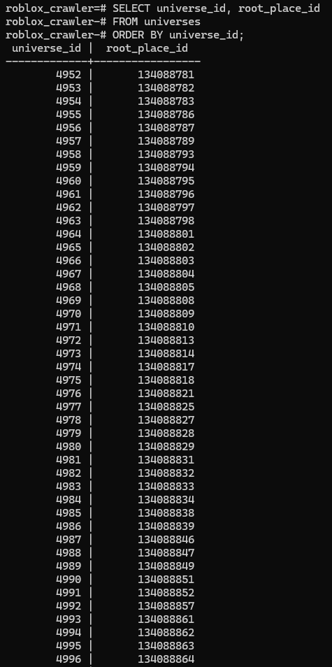 I have proompted the AI to generate me an npm project and psql database looking for a game through universeId. I have browsed through 100,000 UniverseIDs and they're all privated baseplate starter places. I expect to reach a real game at 1,000,000. I'll let it running while I relearn Postgres and JS so I can make different methods for the screamer to look for games.