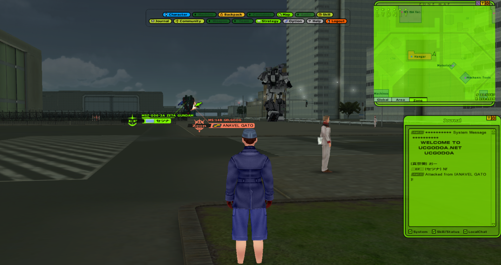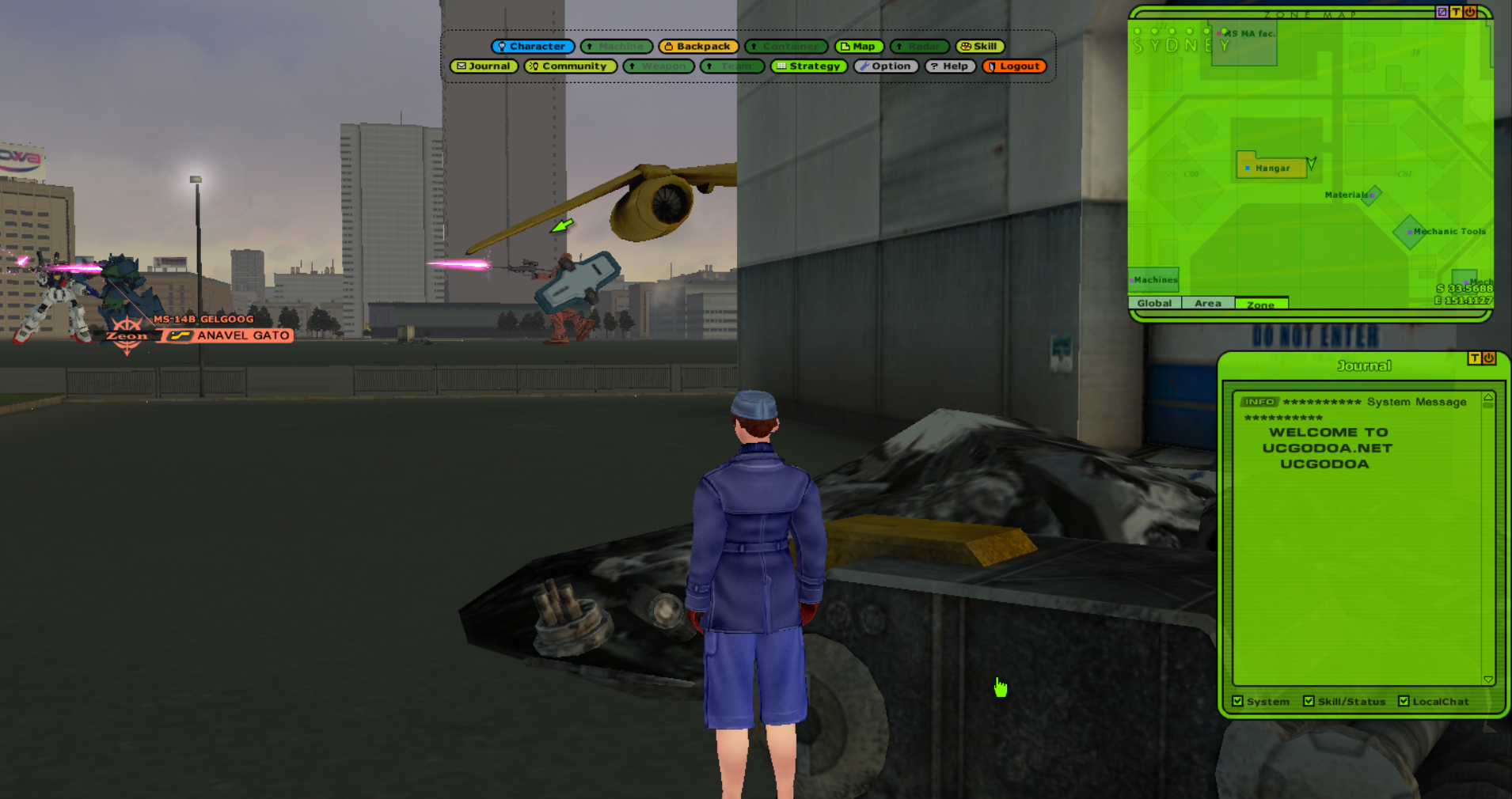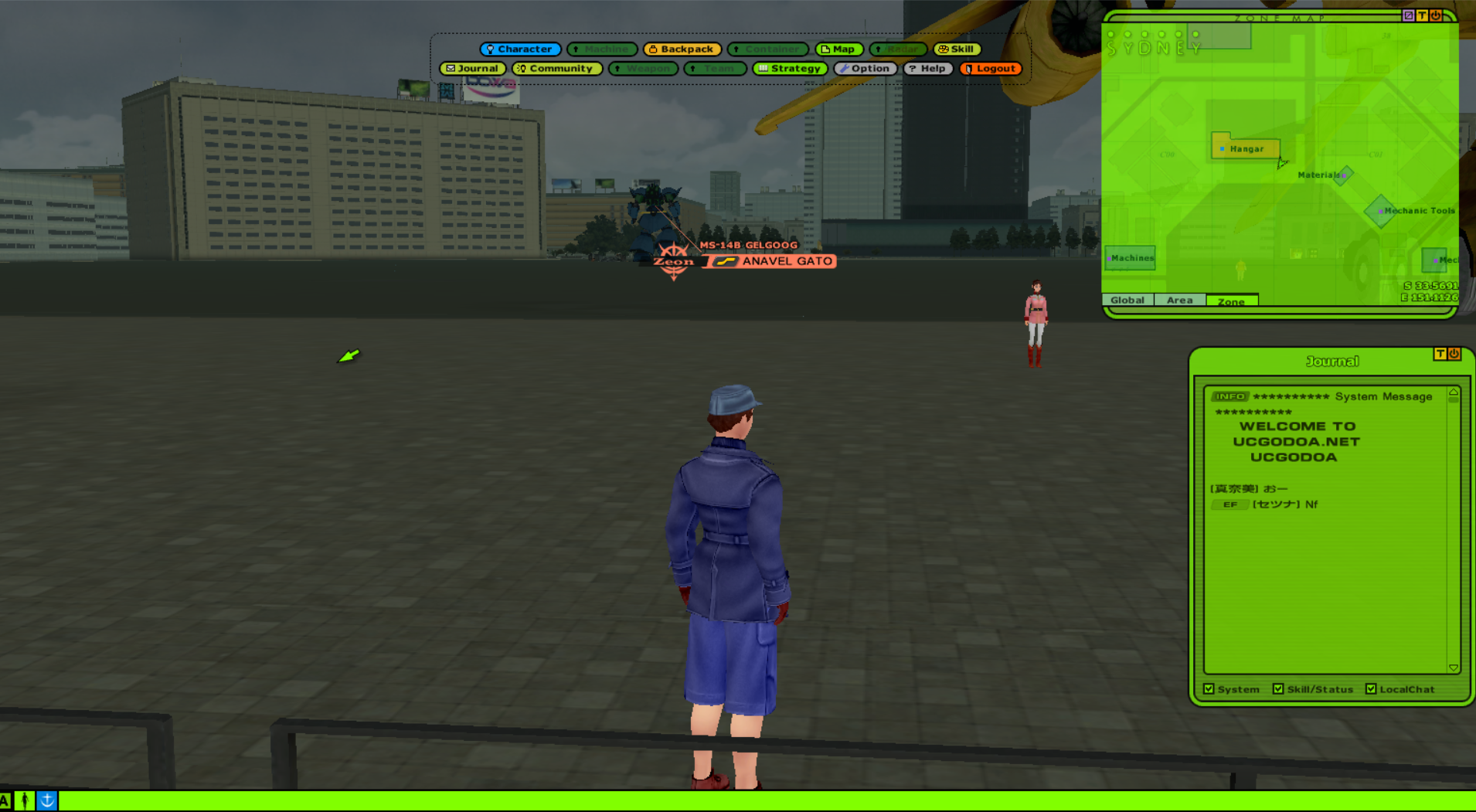 Universal Century Gundam Online is an Ultima-like faction PvP MMO set in the Gundam universe, specifically during the One Year War. You level your character's skills and gather resources to improve your vehicles and mobile suits.>ServerUCGO Dawn of AustraliaGame files + Translation Patch + Updates - https://drive.proton.me/urls/3ABREQK03W#fEE5FtQlzJTmMake sure to launch the game with UCClient-ENG.exe, if you're on Windows and it doesn't work try launching it as administrator with Japanese app locale.>AccountCreating an account is done through the launcher, enter a username and password and it'll create the account if the name isn't taken. Make sure not to forget your account info because there might not be a way to recover it.>FactionMost of us picked Principality of Zeon.Starting city doesn't matter.>GuildFourCloverCorpsAsk in the thread for an invite.>MiscDOA Wiki: https://w.atwiki.jp/ucgodoa/UCGOHost Wiki: https://wiki.ucgohost.com/index.php/Main_PageThe MMOdventure anons will be playing this for the next 2-3 weeks. Feel free to check it out.>>2051131
