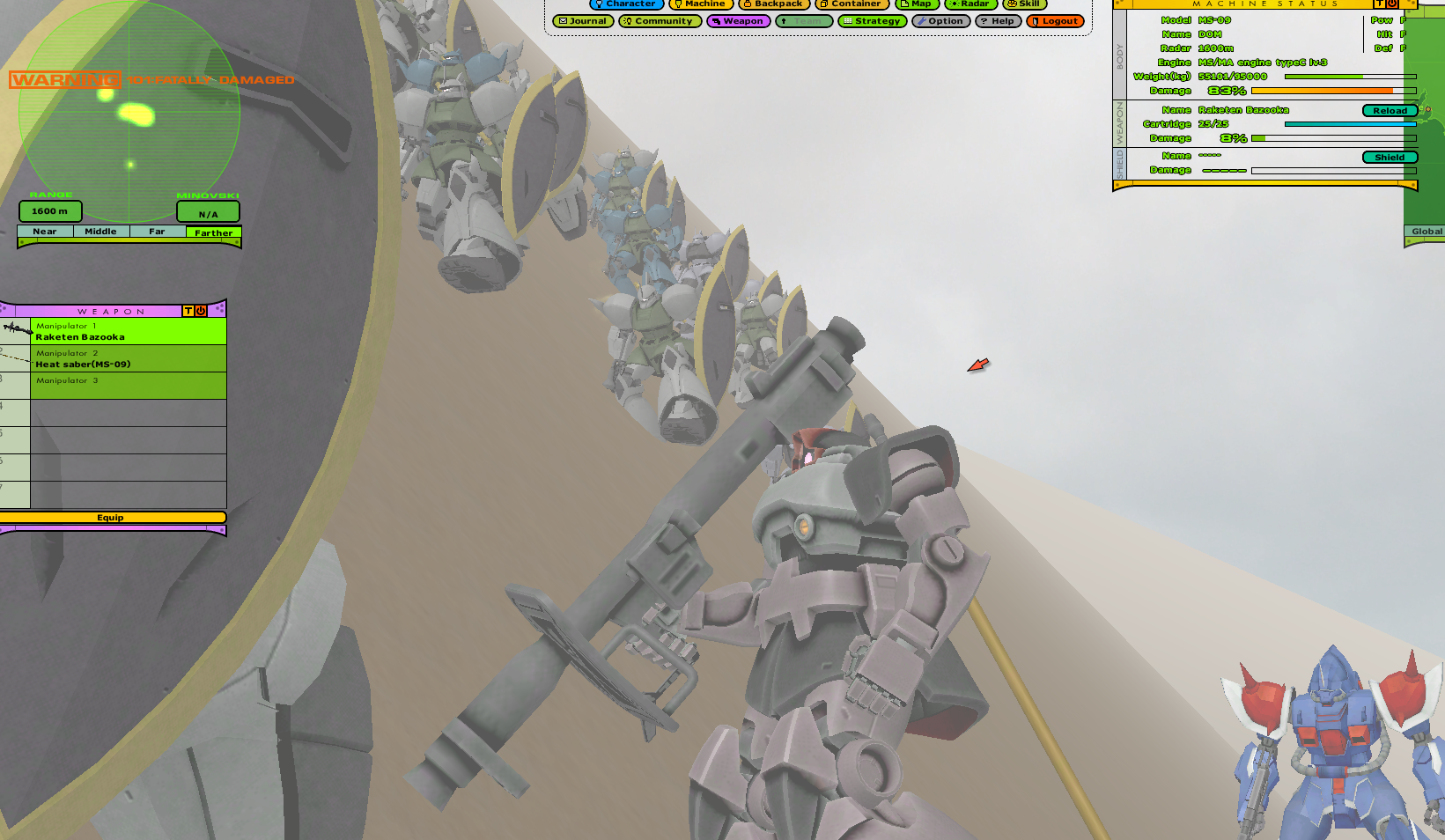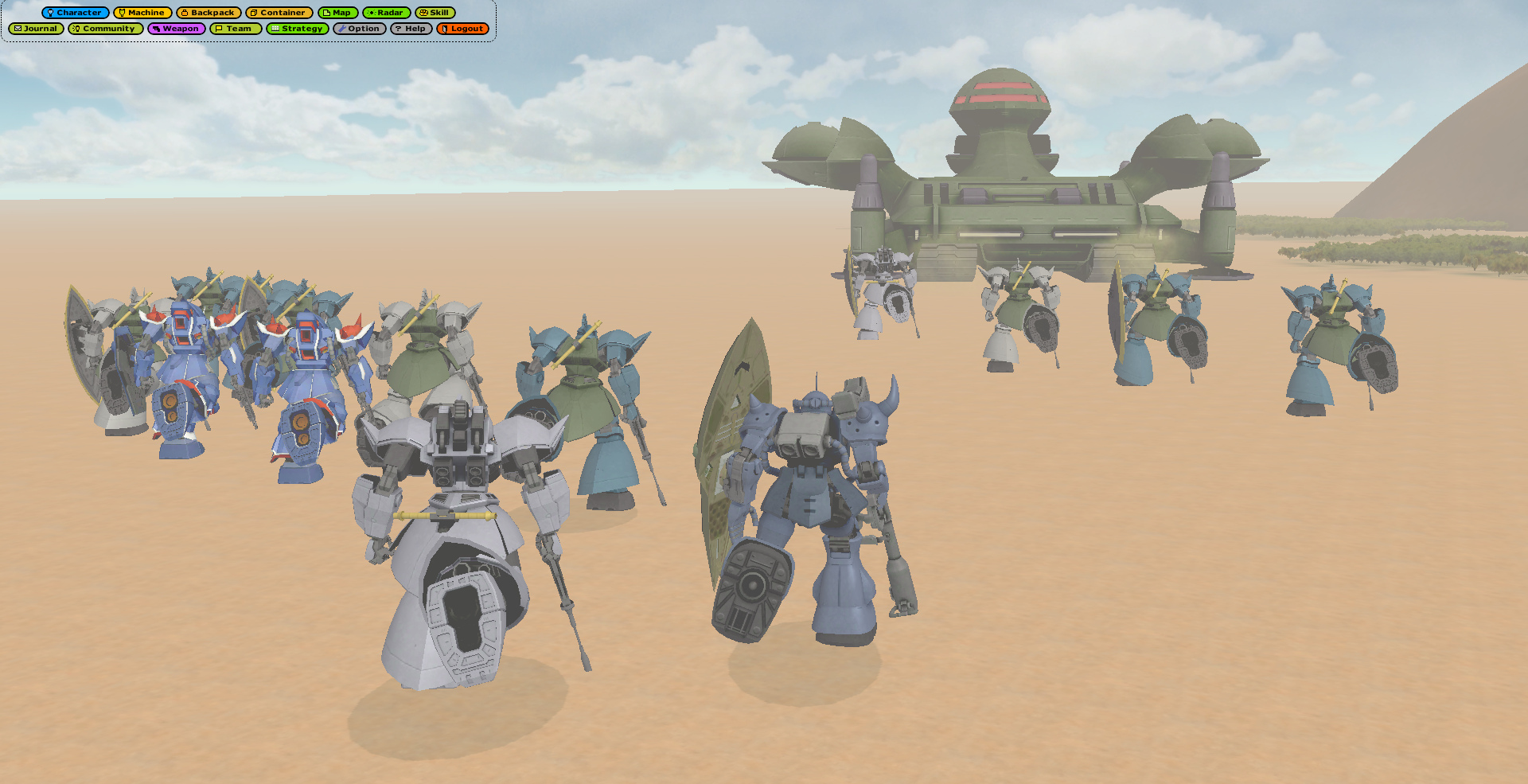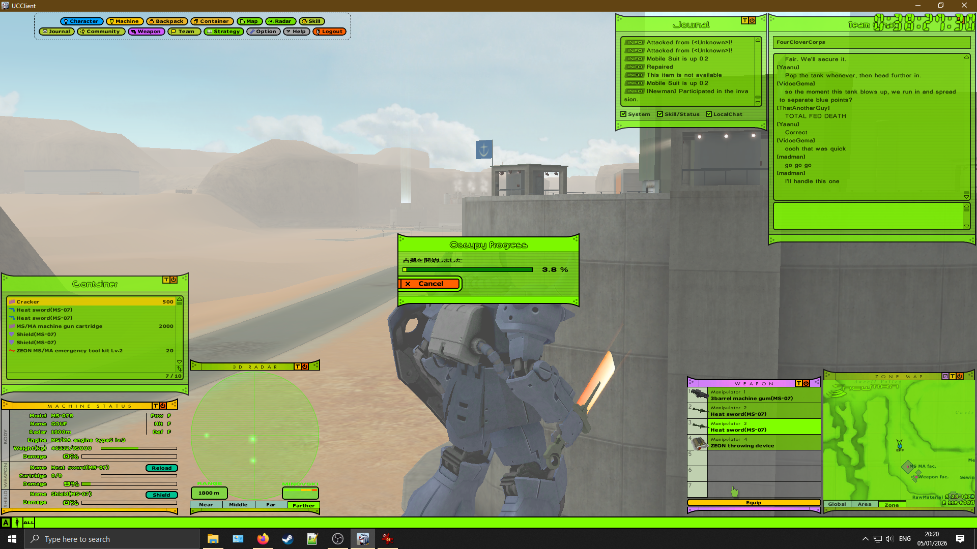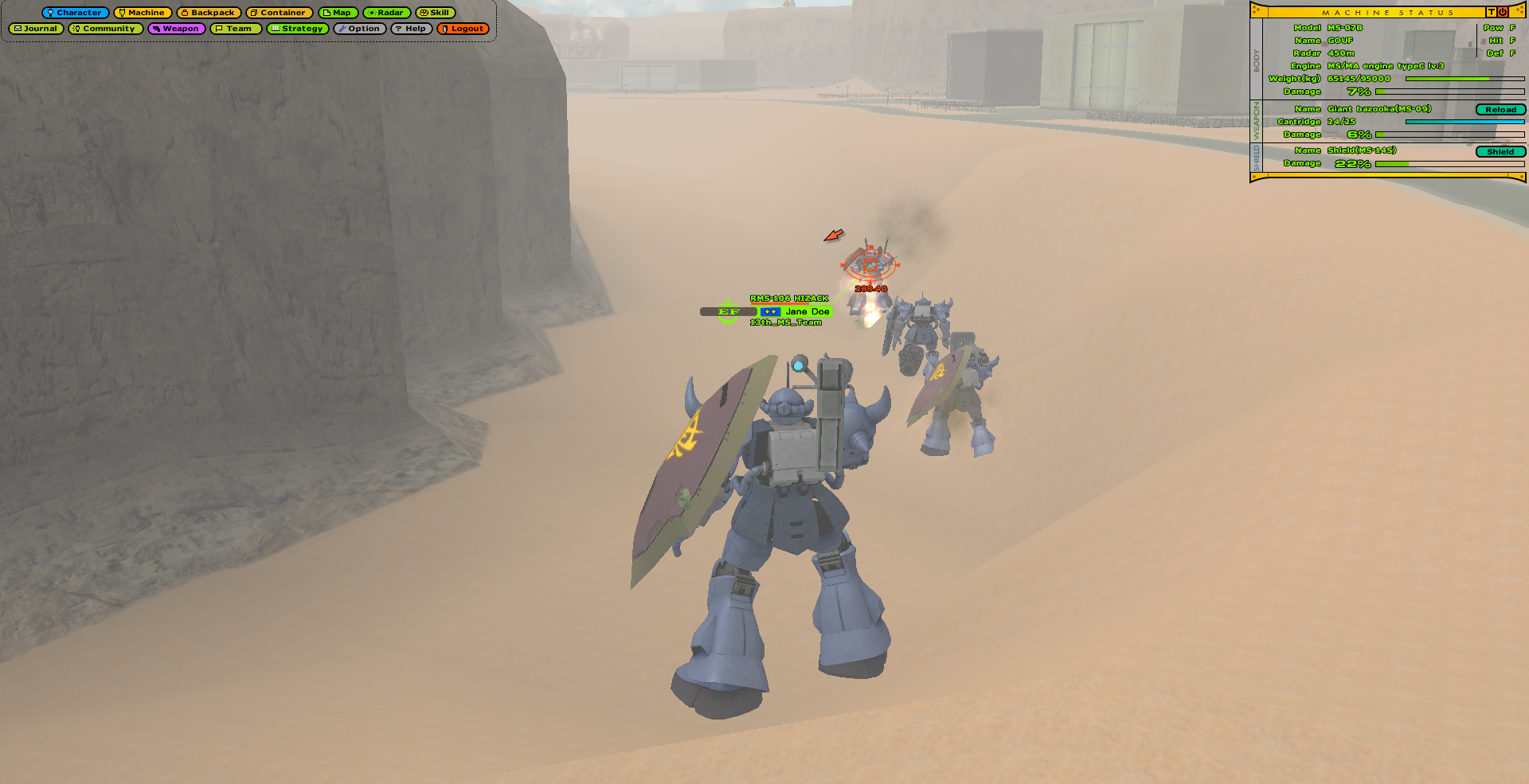 Universal Century Gundam Online is an Ultima-like faction PvP MMO set in the Gundam universe, specifically during the One Year War. You level your character's skills and gather resources to improve your vehicles and mobile suits.>ServerUCGO Dawn of AustraliaGame files + Translation Patch + Updates - https://drive.proton.me/urls/3ABREQK03W#fEE5FtQlzJTmMake sure to launch the game with UCClient-ENG.exe, if you're on Windows and it doesn't work try launching it as administrator with Japanese app locale.>AccountCreating an account is done through the launcher, enter a username and password and it'll create the account if the name isn't taken. Make sure not to forget your account info because there might not be a way to recover it.>FactionMost of us picked Principality of Zeon.Starting city doesn't matter.>GuildFourCloverCorpsAsk in the thread for an invite.>MiscDOA Wiki: https://w.atwiki.jp/ucgodoa/UCGOHost Wiki: https://wiki.ucgohost.com/index.php/Main_PageThe MMOdventure anons will be playing this for the next 2-3 weeks. Feel free to check it out.>>2051131