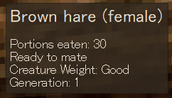 >>2174682My hares are now 30+ portions eaten. Still says ready to mate. Time to release the male rabbit then. I think the rabbit needs to eat. Or at least get much closer to the hares. A fence might be too thick.