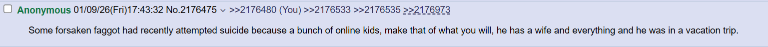 Some forsaken faggot had recently attempted suicide because a bunch of online kids, make that of what you will, he has a wife and everything and he was in a vacation trip.