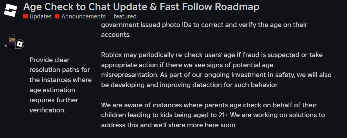 Reposting>As the first large online gaming platform to require facial age checks for users of all ages to access chat, this implementation is our next step toward what we believe will be the gold standard for communication safety.>Age-based chat makes it easy for users to communicate with others in similar age groups for age-appropriate conversations.>Images and video used for Facial Age Estimation are deleted immediately after they’ve been securely processed.>Users who want to appeal their age check can verify their age using alternative methods, including ID verification or parental controls that allow parents to update their child’s age.>In the coming months, we will require age checks for creators to access Roblox Studio’s real-time collaboration features and update our policies around Roblox communities.https://corp.roblox.com/newsroom/2026/01/roblox-age-checks-required-to-chat