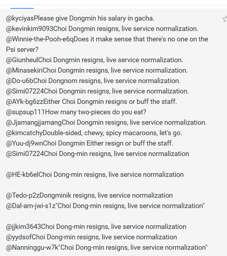 • puts weekly limits on dungeons, reduces drop rates and calls it re:fined >director min: "It's fun now right?">> "no, now we'll play less!"• extends limits of content be account-wide, makes neartite, reduces drop rates more and adds slop items, uses test servers to get streamers to praise liveteam devs instead of quality assurance testing. resulting in many live-server bugs like the sprite library getting scrambled>director choi: It's fun now right?>> "NO! we want to play the game!" said many players• releases a survey with polarizing results after asking if less content/dungeons, more limits, and shorter braindead content is satisfactory. > director choi: "It's fun now right?" >> "You're doing this on purpose aren't you?!"