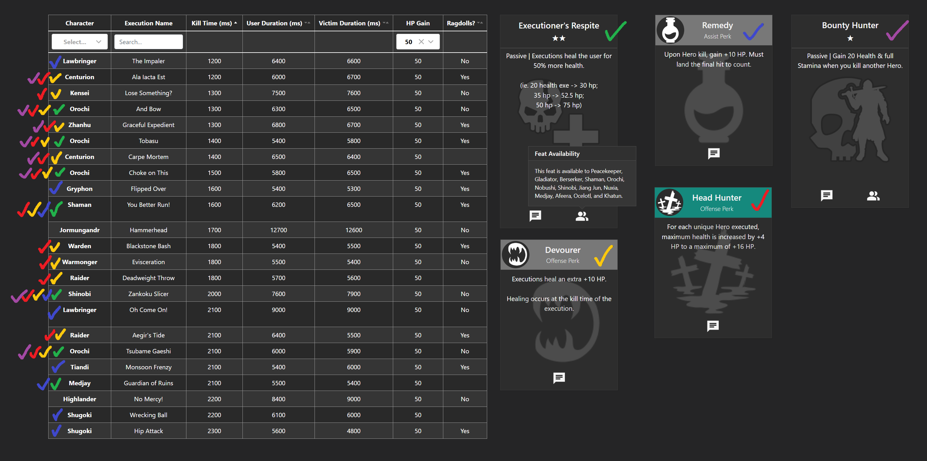 the fastest ki8lling universal execution is the That's Cannon, which kills in 2200ms and lasts7800msanything faster than 2200ms is automatically a unique strength, and having perks or feats that can boost that strength are worth speculating on***this is only for 50 HP executions, which are the only ones that really matterif an Orochi gets a kill in a teamfight, they can heal themselves 105 HP often before anyone can stop them