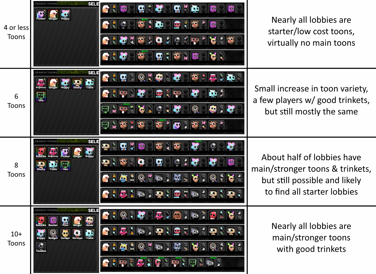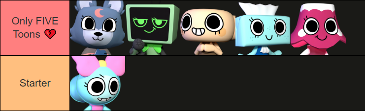 A cruel question, Tooners... If you had to have five and ONLY five toons on your account, who would you pick?- Starter toon isn't included in the 5 to give some wiggle room- Unlock criteria IS required, however (e.g. you can't have Vee in your 5 without including Brightney, and owning toons like Yatta or Blot is just impossible, etc.)Eclipse is my favorite and I can live with having only one distractor toon. But sacrificing TWO whole slots to Tisha/Brightney just so I can own Vee and Shelly really hurts. It leaves no room for me to have Ginger, and I love healing as the cute cookie girl so much. Alas...
