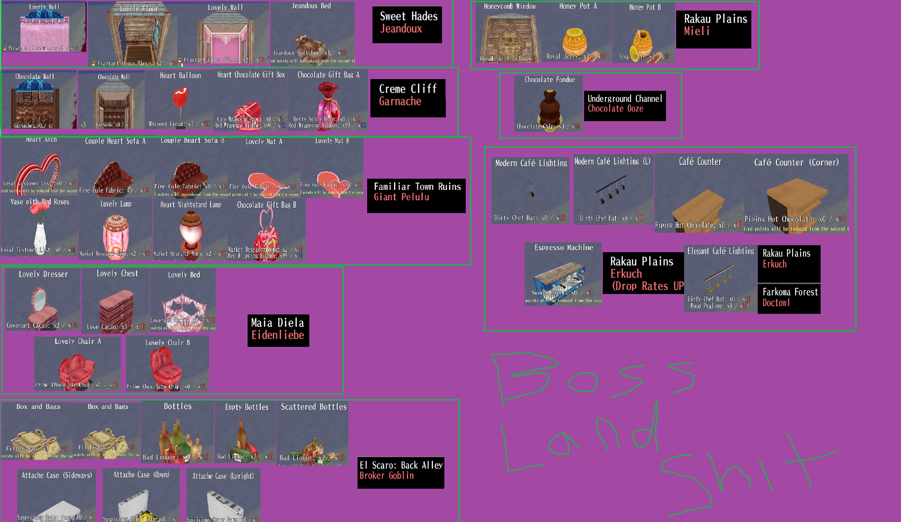 heres another shitty picture with the boss drops for land items. did i miss any? maybe.