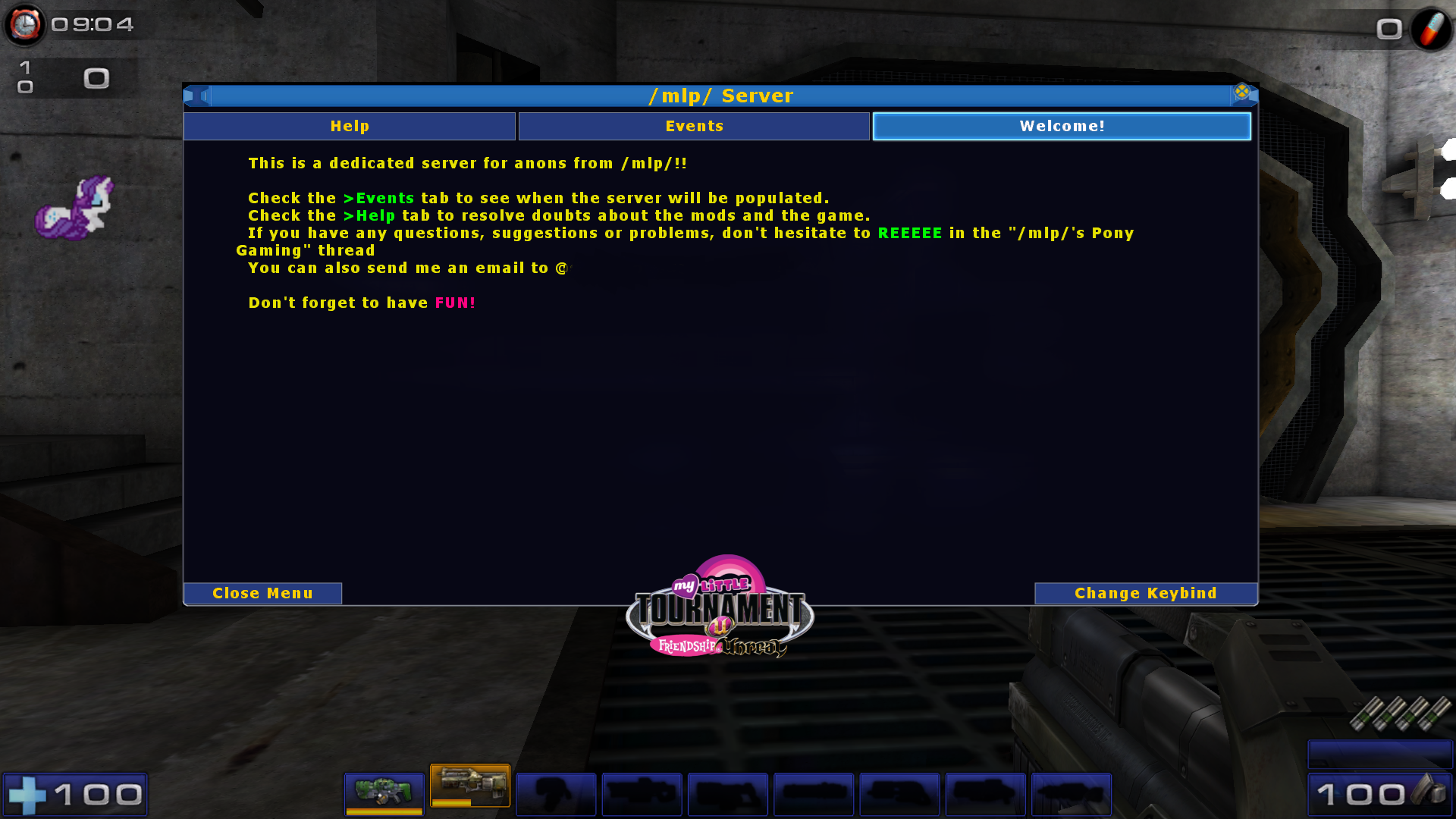 >>2243926UT2004 has some pretty active servers, check the yt channels and you will see how much active they are:>miasmarocks (VCTF, although with the berserk mutator on)https://miasma.rocks/https://www.youtube.com/@wishnix60/videos>Omnipotents, Onslaughthttps://www.omnipotents.com/https://www.youtube.com/@AnonymousUT/videos/mlp/ has an active server with custom mods (pic related is the server menu), we just played a few hours ago, 3 hours nonstop:https://ponepaste.org/11301>>2244284Still not sure how to match soundpacks to models in the event they aren't bundled together - can anyone say if it just has to be a naming convention match?Yeah, you have to put the exact name of the voice pack in the character's uplCheck out the modpack from the /mlp/ server that I just posted above and look at the characters' .upl files and the names of the voice packs for referenceYou have to do it manuallyAt least if we're talking about the same thing: if you put a bot with x skin, it will play its corresponding voice packWhen you use it, you have to choose it manually; it doesn't change automatically when you change skinsAlso, you're using Paul Catalano's Voice Packager, right?It doesn't have much to do with what we're talking about, but I suggest you try it if you're not already using it because it's a very good tool