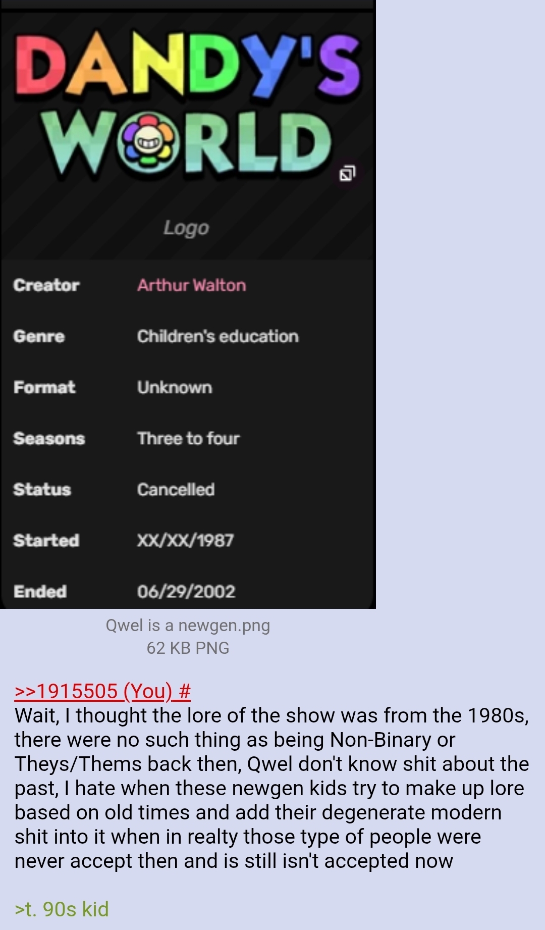 >>2254992To answer what happened:First, Qwel announced a new toon, Squirm, along with a new floor and achievements.Second, a drama where an anon that posts about his Dandy's World AU went to the drawpile, and when he saw someone making a shota version of one of his drawings, he kept scribbling over it, and in 4chan fashion, more people joined in, resulting in the anon having a meltdown, and being banned for deleting a layer enough times to cause everyone else to lag out.