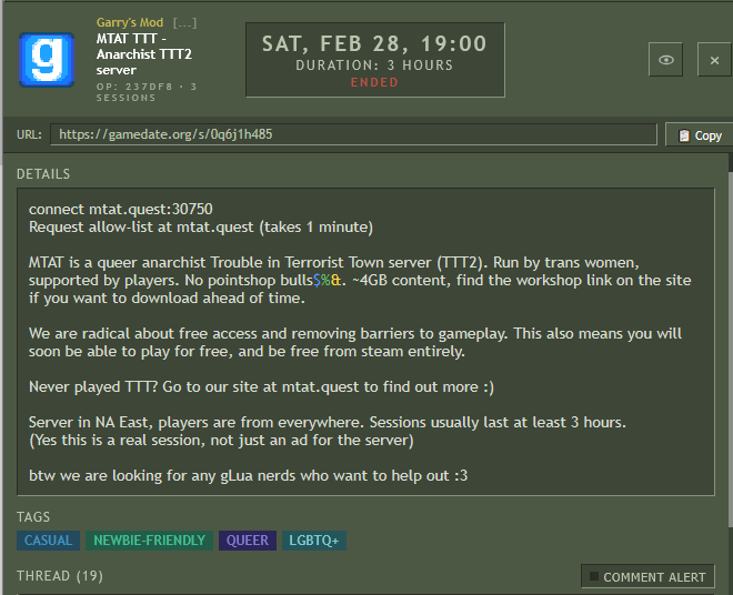 >>2283276>Most of the examples listed are people posting their 'cord links/social media anywaysNot even sure what you mean by that.If you mean the examples posted here>>2283172then actually not. The only one that even lists a discord is Atlyss and it explicitly has lobby deets if you don't want to use discord, so it's not really all that much of an issue anyways.If you mean the lobbies already hosted on the site as a whole, honestly it's actually worse than that, lol. "MOST" aren't posting any deets at all, 'cord or lobby or otherwise. They'll just say "play game" or "we'll figure it out" or maybe a shallow inkling of how you'll connect. People really don't know how to host at all.But all of this is also just secondary to the fact that you can host yourself, lol. Be the change you wanna see.