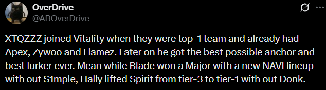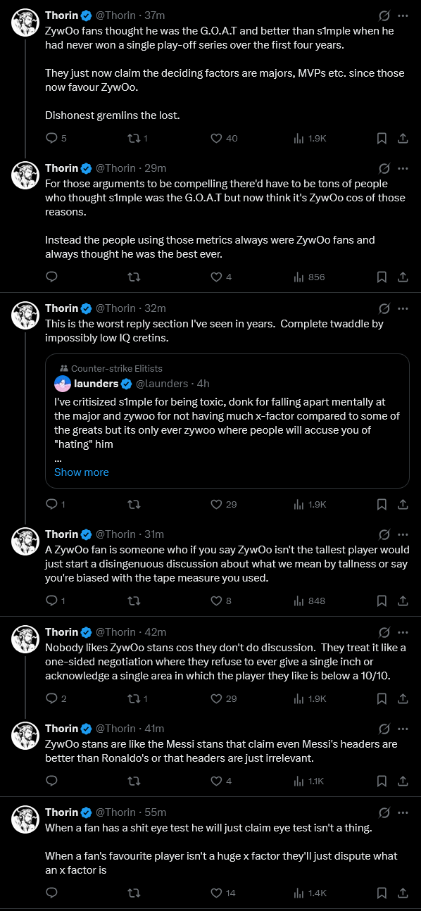 thorin is on a generational meltdown on twitter about "zywoo fans"what a sad old man who can't gripe with the reality of godwoo eclipsing p1mple in everything but intangibles that can be made up at the spot