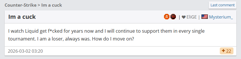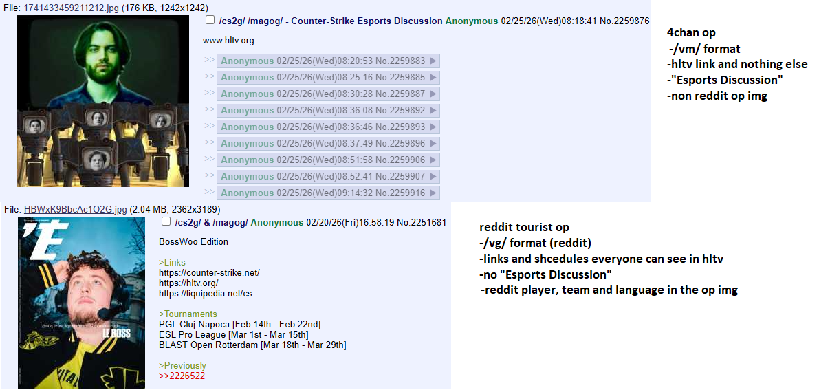 >>2259892Hltv has all the relevant information one click away, but for some reason some loser sperg insists on adding a bunch of useless info on the op and malds, seethes and reports anything that doesn’t have it.