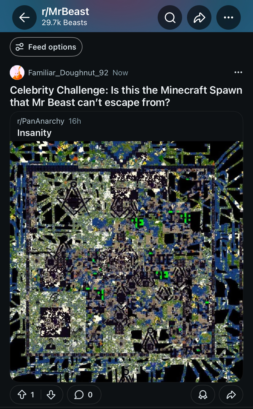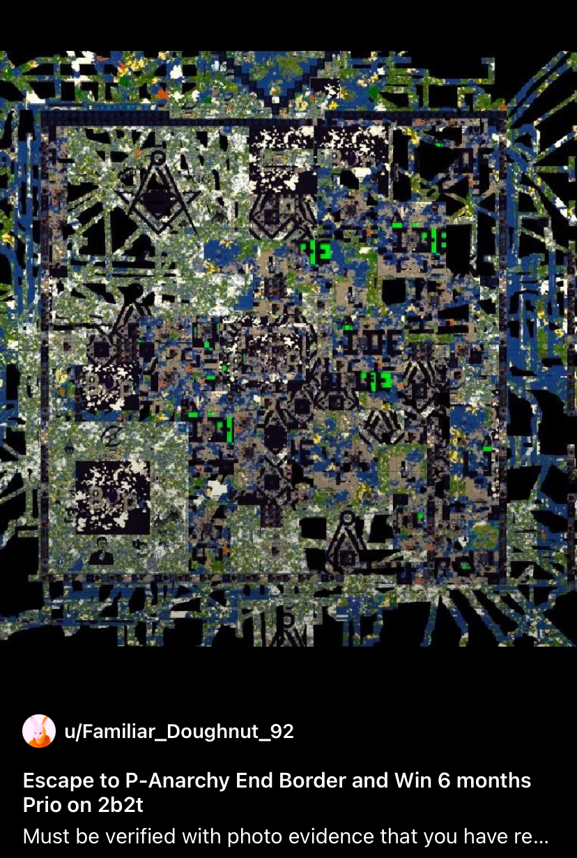 P-anarchy is exposing the identity crisis of 2b2t.2b2t doesn’t know what it is, and this is because it became too many things at once.Let’s examine some of 2b2t’s structural contradictions:2b2t is an “Anarchy” server… that has an items shop, monetisation and a priority access paywall.2b2t is “edgy” and “outsider”… but is the most visible anarchy server on YouTube.2b2t is “inappropriate”… but is promoted by Mr Beast.2b2t is framed as brutal and unforgiving… yet its spawn is relatively easy to escape by modern Minecraft Anarchy standards.2b2t is marketed as “unchanged history”… but there is heavy documented evidence of 2b2t admin deleting, altering and changing their server map.2b2t encourages “freedom of expression”… but is covered in Freemason imagery and run by powerful factions that invite you to initiation ceremonies, and expel you from the server if you fail or refuse.2b2t is marketed as community of players that are dynamic and exciting… but encircles the same FitMC and PopBob personality cults that don’t ever change.2b2t presents as a server that is forever changing… but it’s a museum where change is actively resisted.All this begs the question.What the hell is 2b2t?P-anarchy, on the other hand, has a very clear identity.P-anarchy is the hardest Minecraft Spawn of all time.We have lore that is consistent and makes sense - this is CRUCIAL for player immersion.It is quite simply impossible to become immersed in 2b2t because of their structural identity crisis.